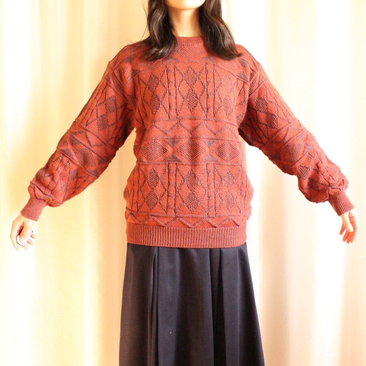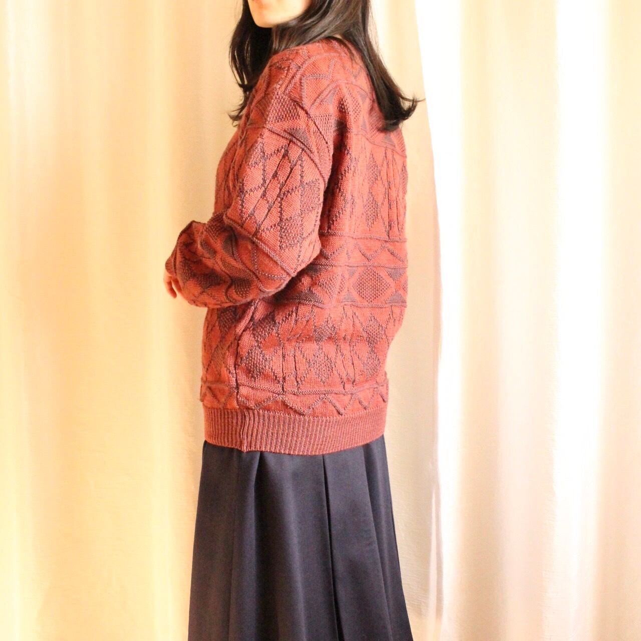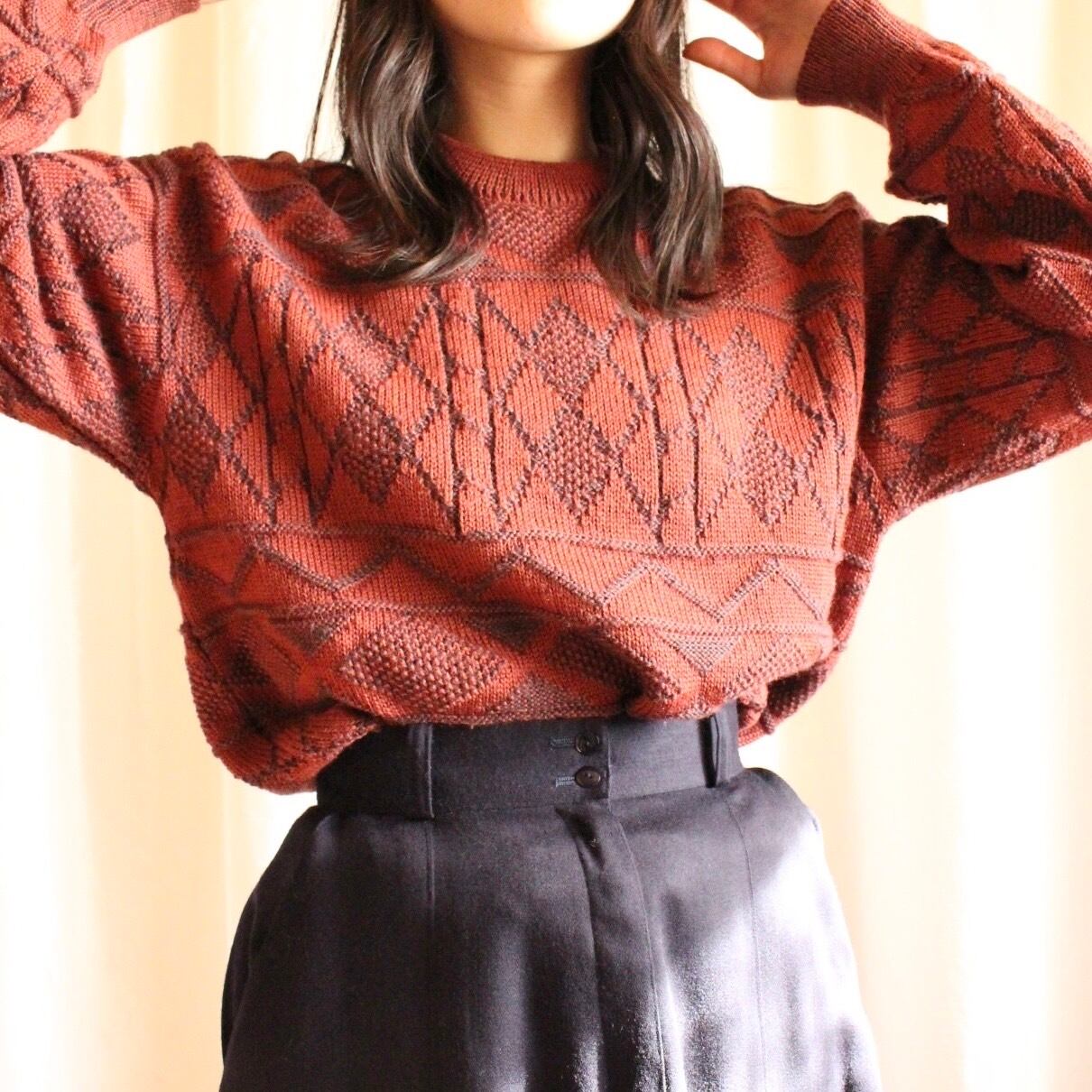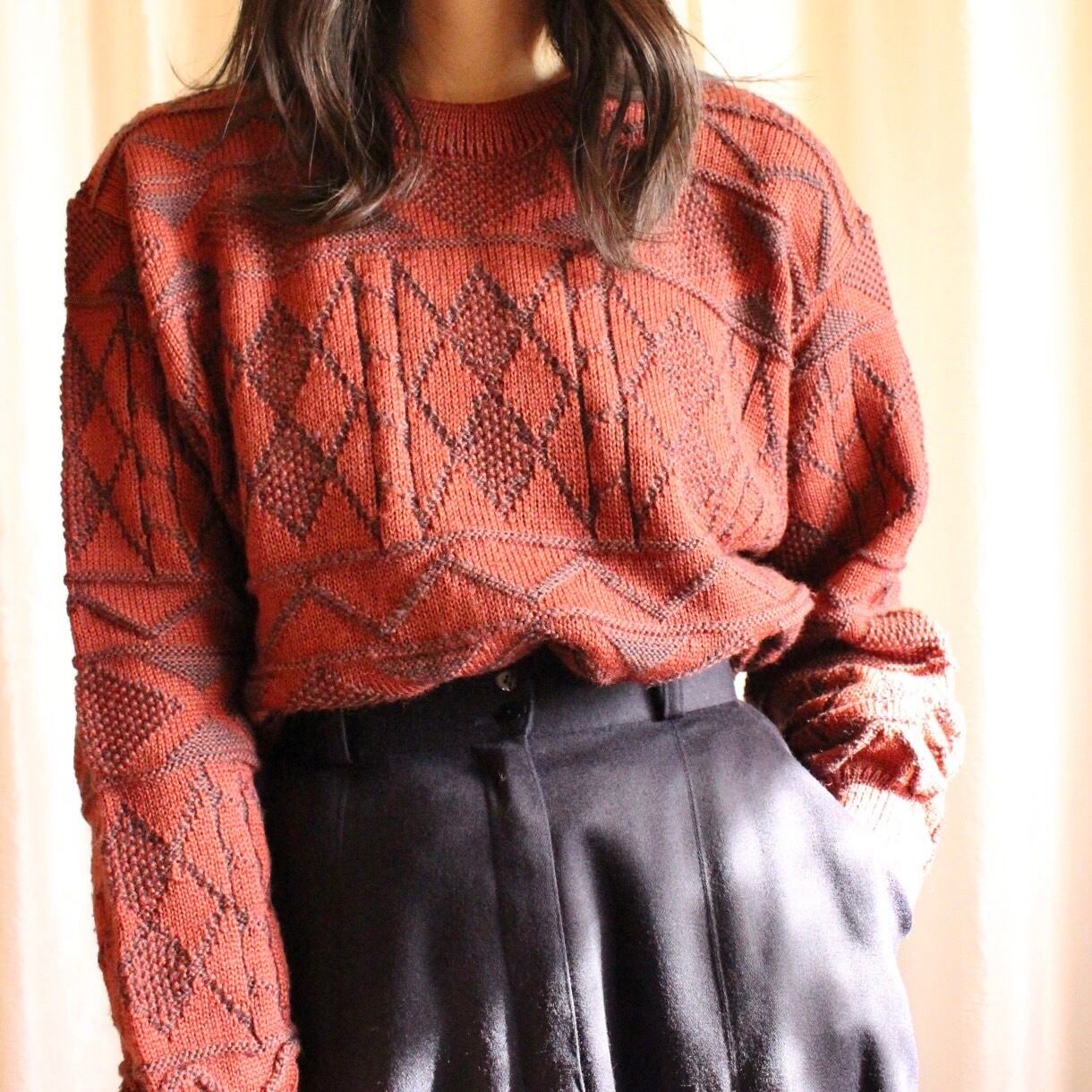 ゆったりオーバーなシルエットと、古着ならではの幾何学模様が魅力のワインレッドカラーのニット◎