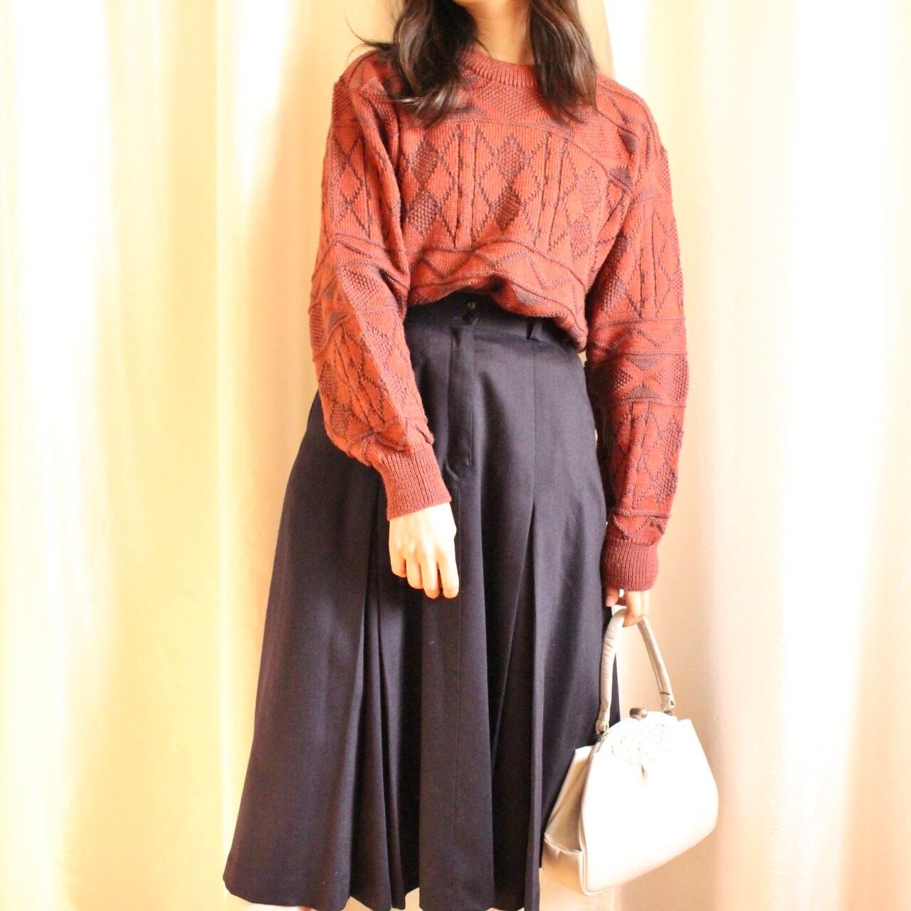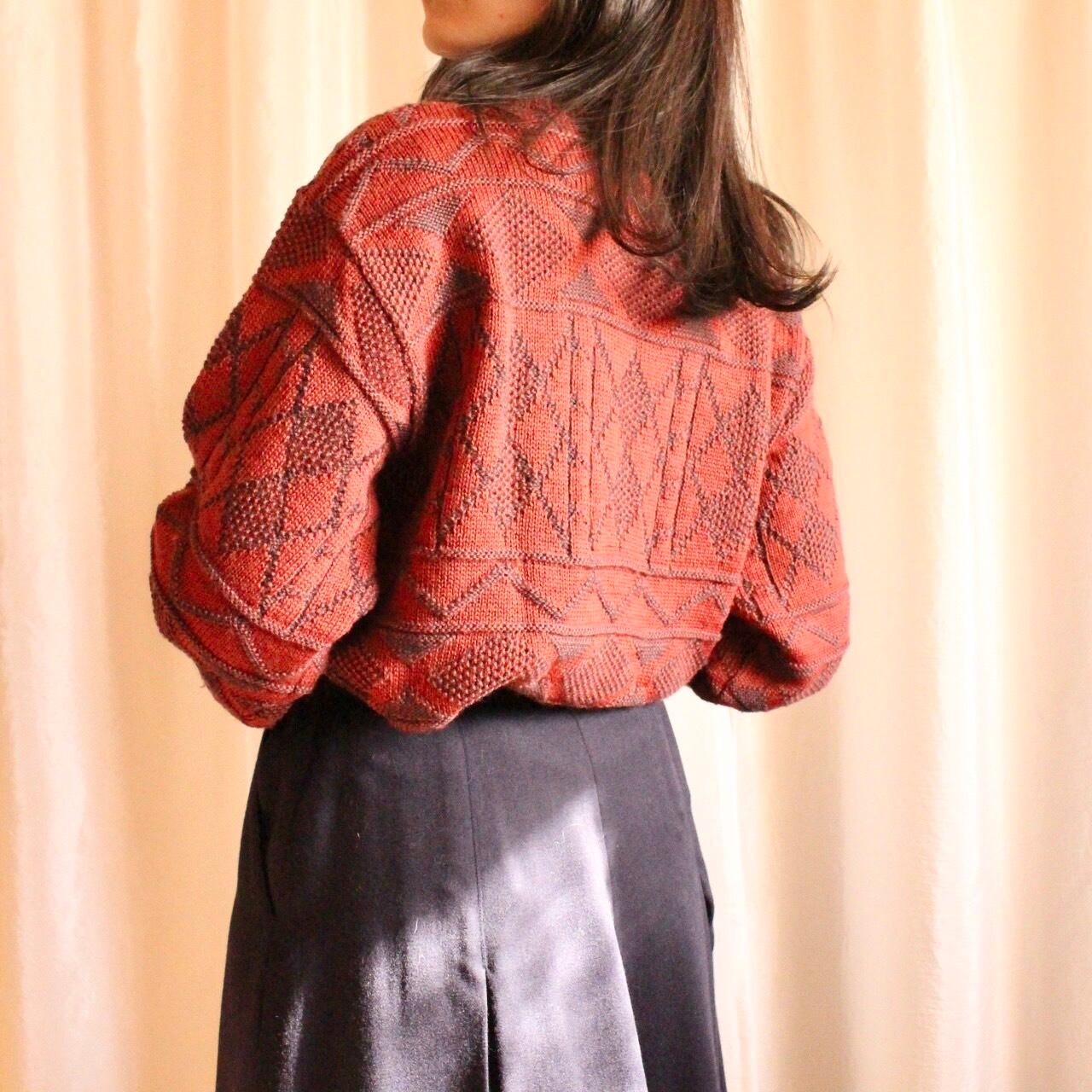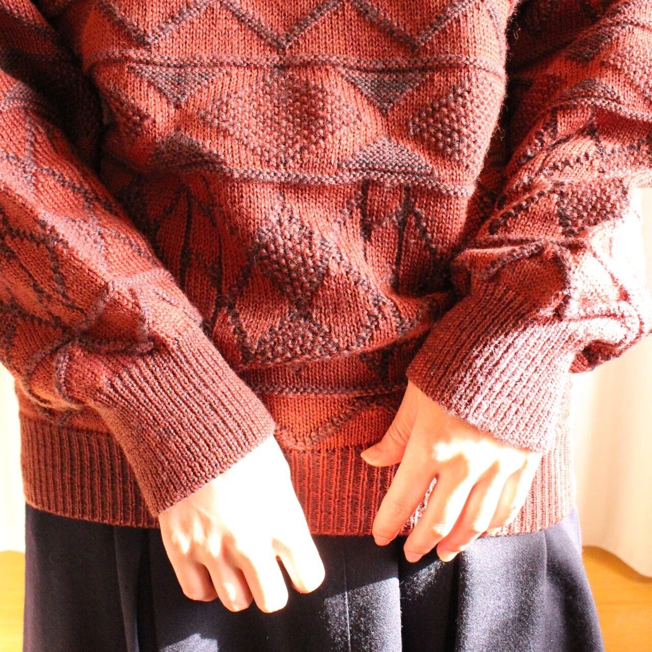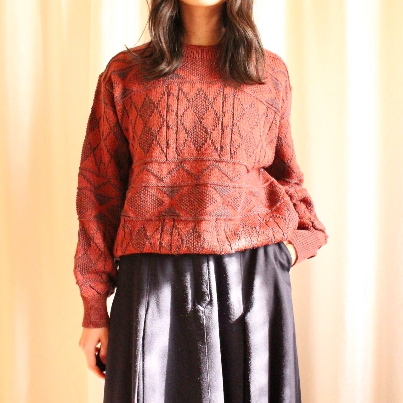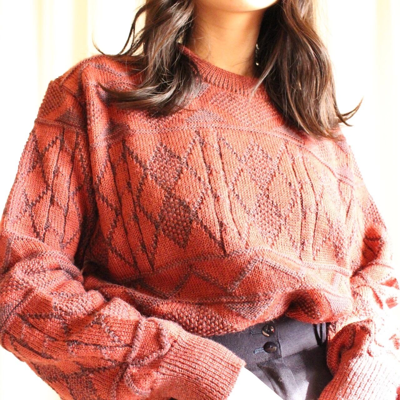 ゆったりオーバーなシルエットと、古着ならではの幾何学模様が魅力のワインレッドカラーのニット◎