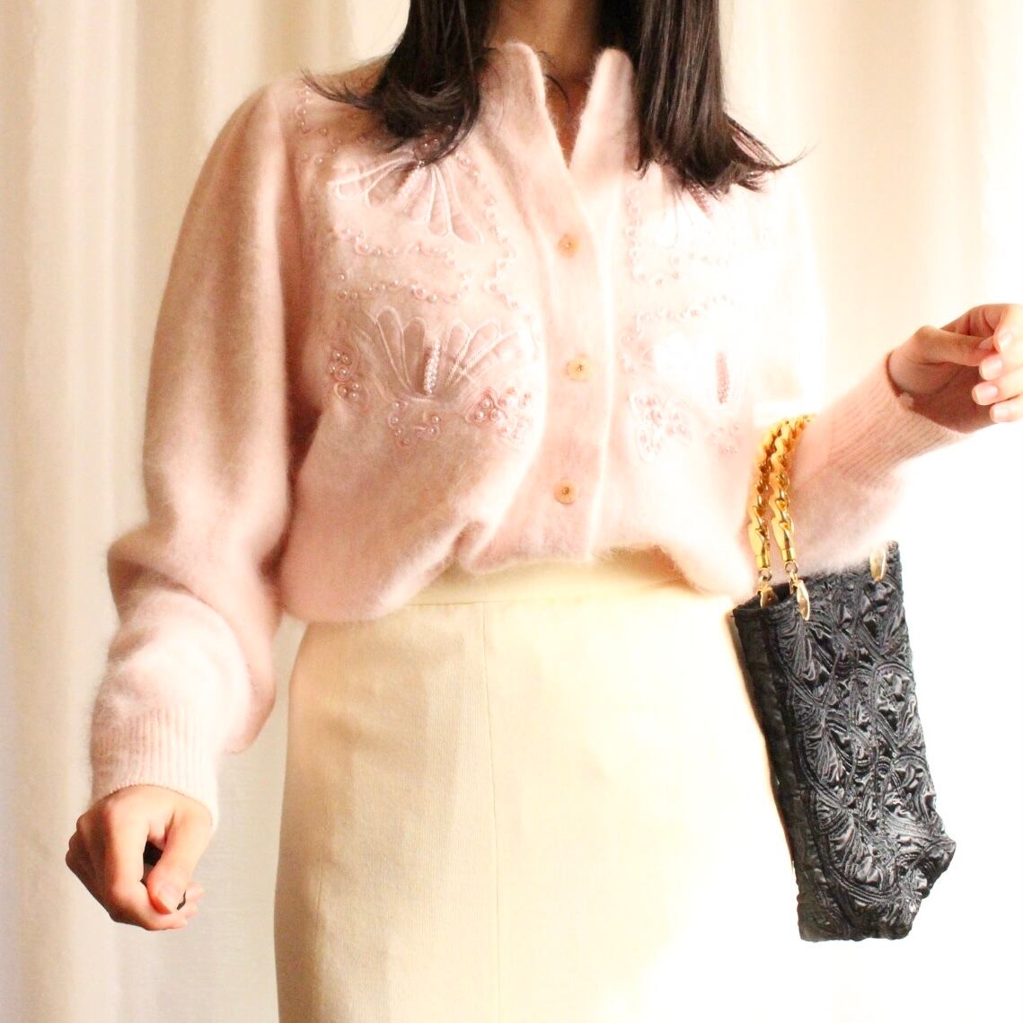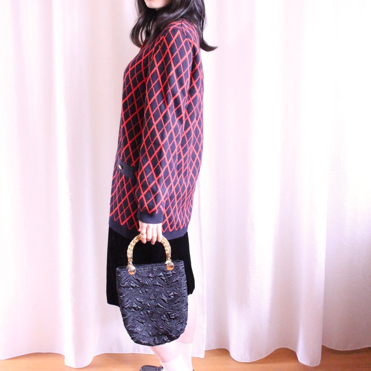 ぽこぽこ生地がレトロで、かつゴールドのハンドルとの色合いが大人っぽいハンドバッグ。