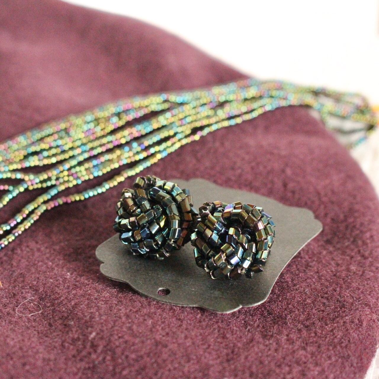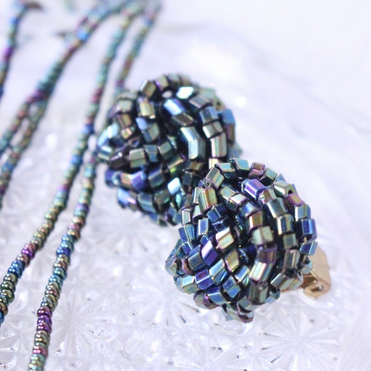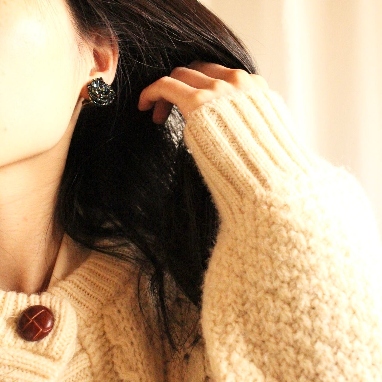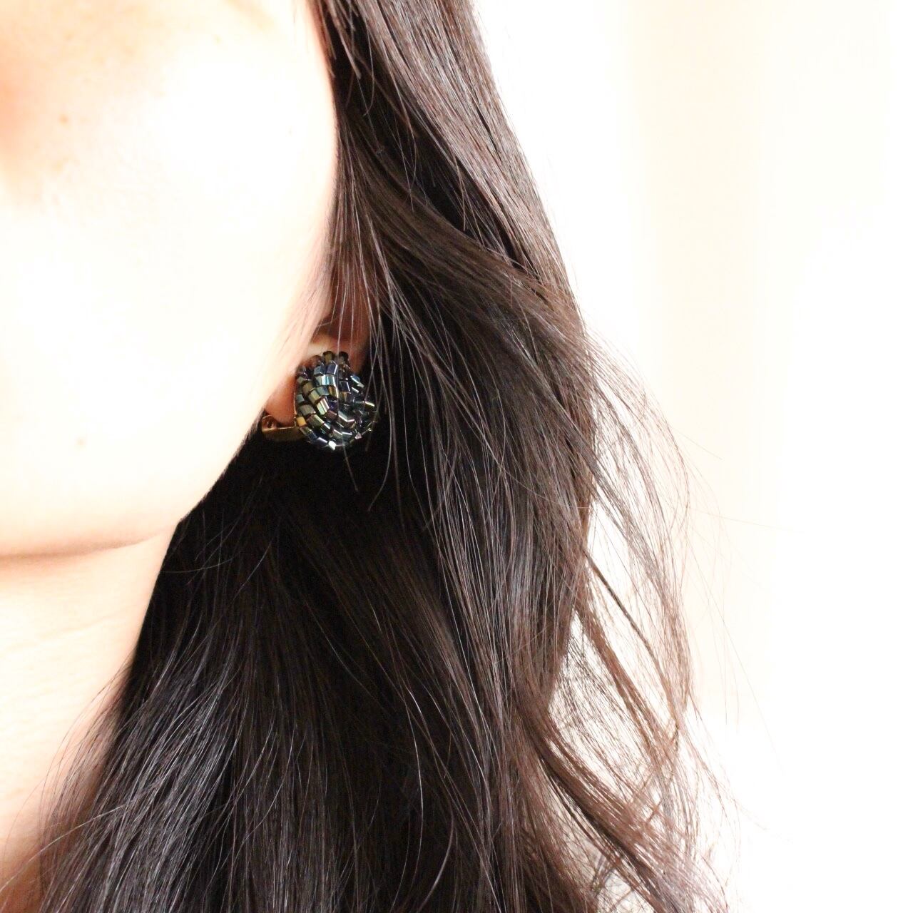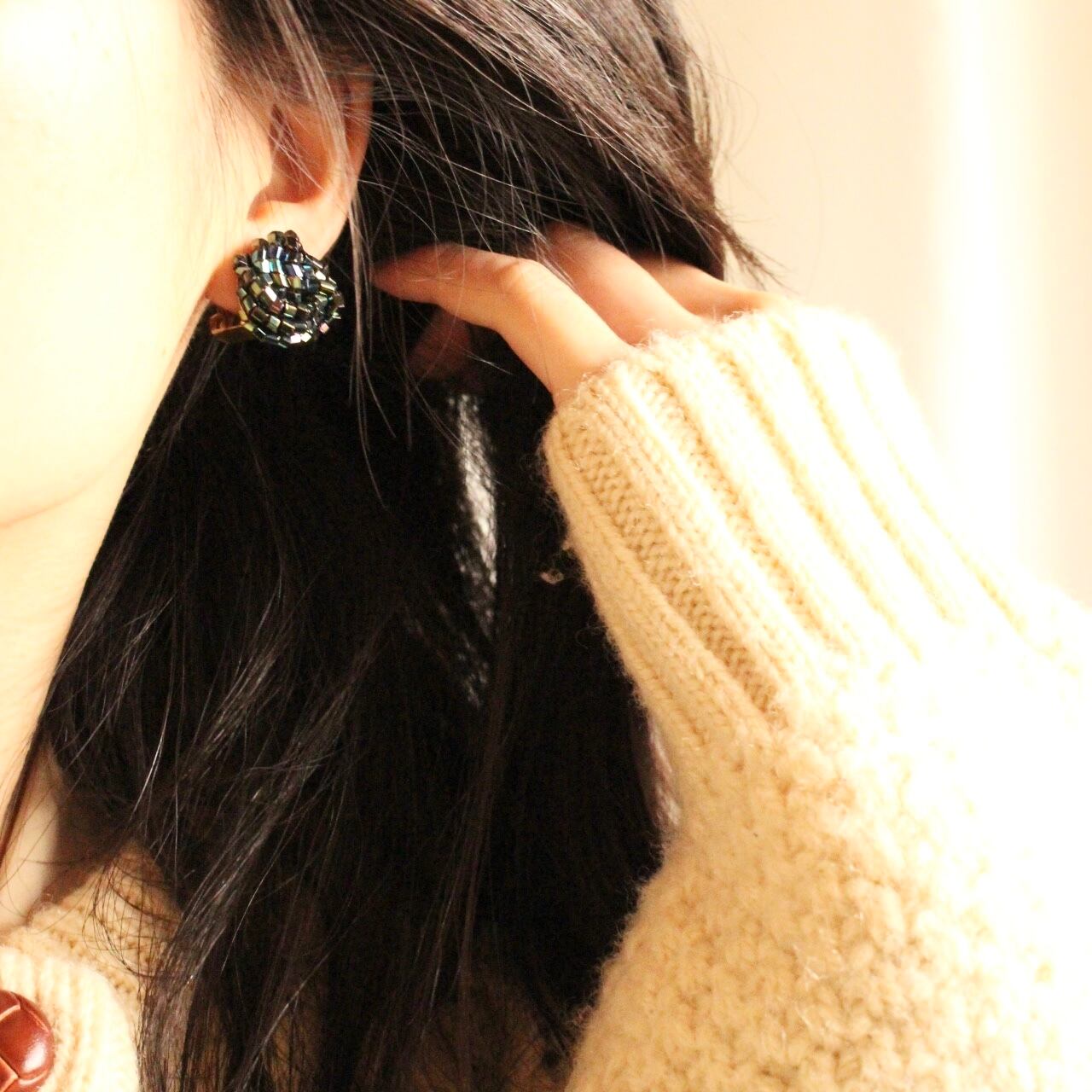光の当たり方で見せる色味の変わる玉虫色ビーズが何とも魅惑的なイヤリング。