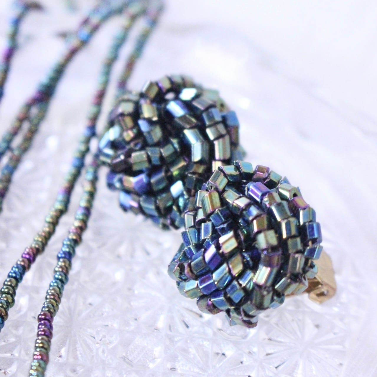 光の当たり方で見せる色味の変わる玉虫色ビーズが何とも魅惑的なネックレス。