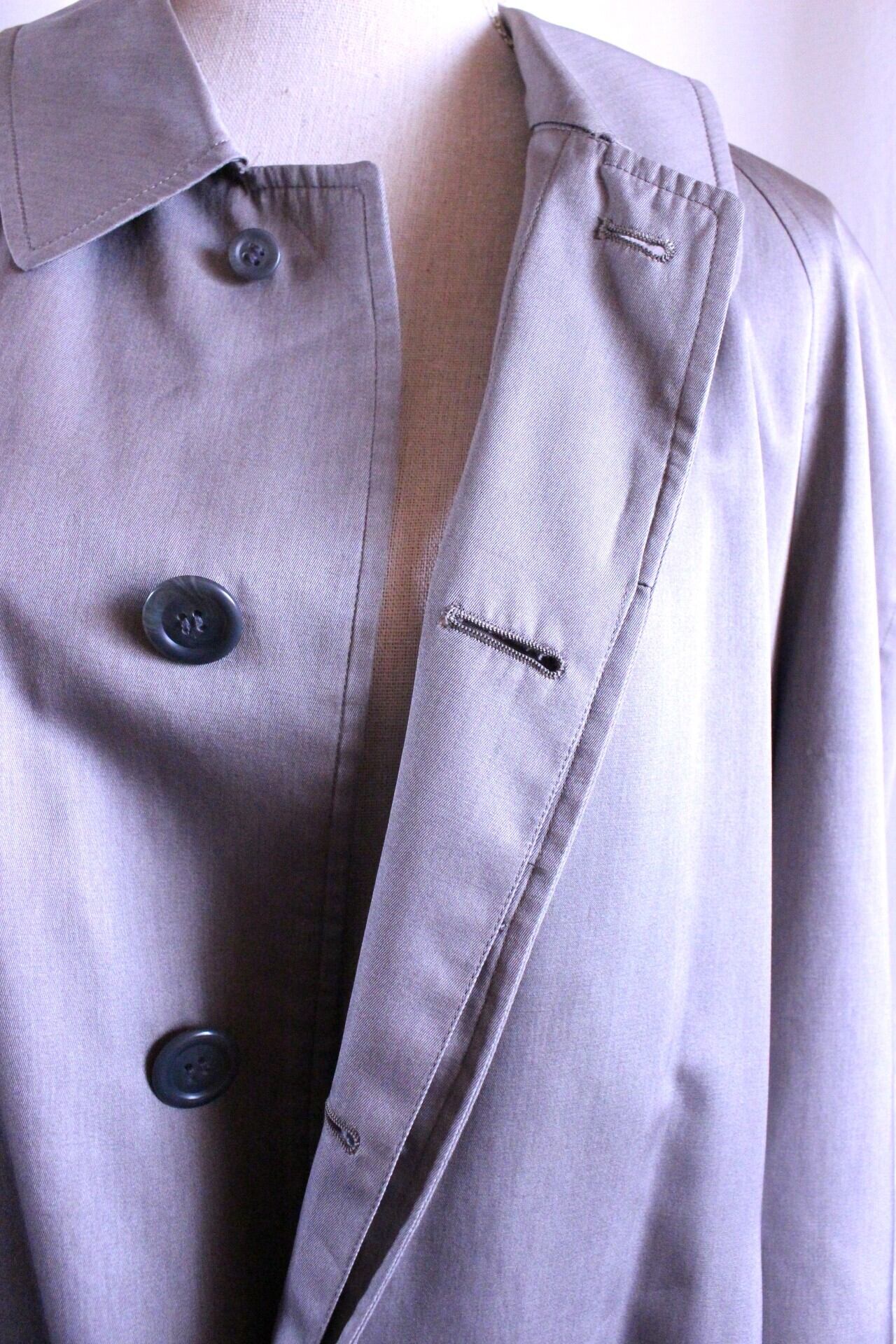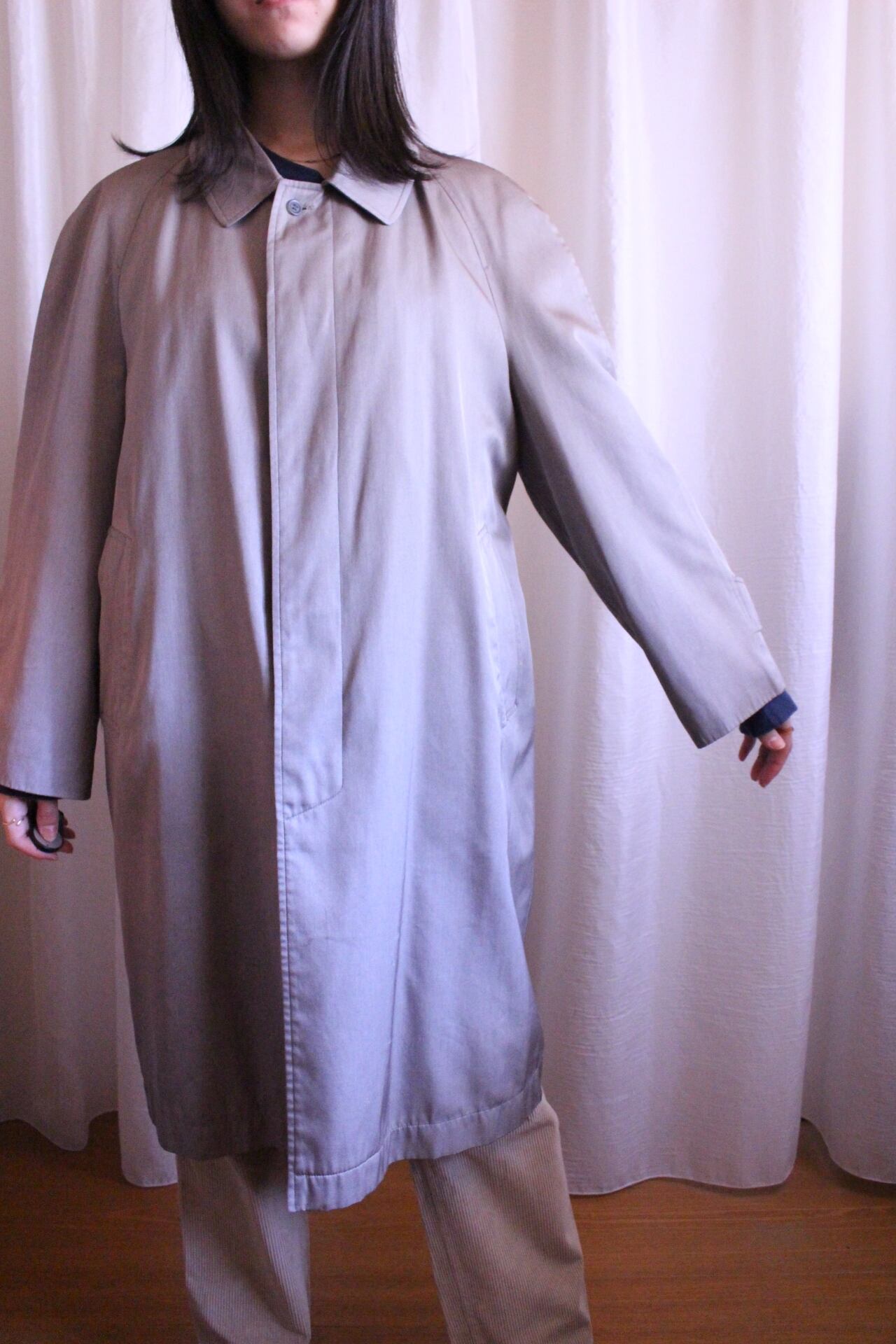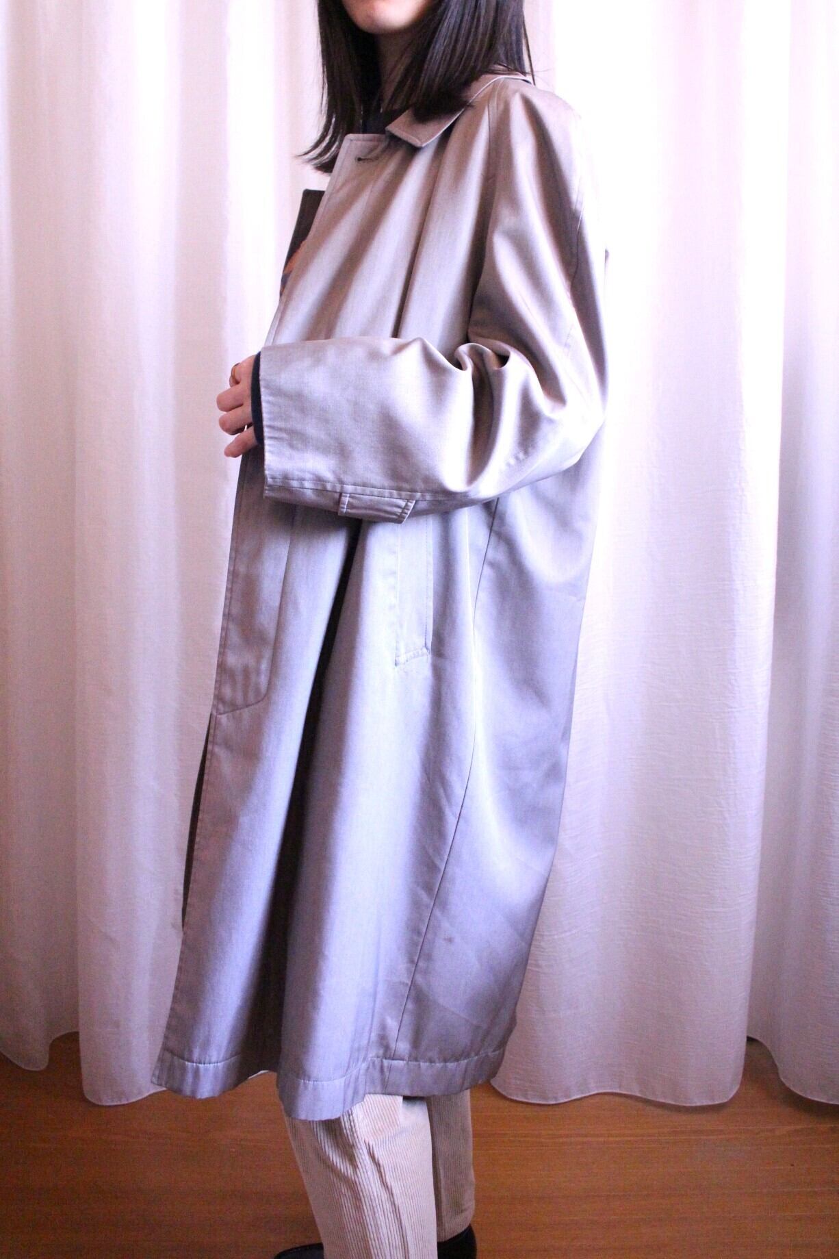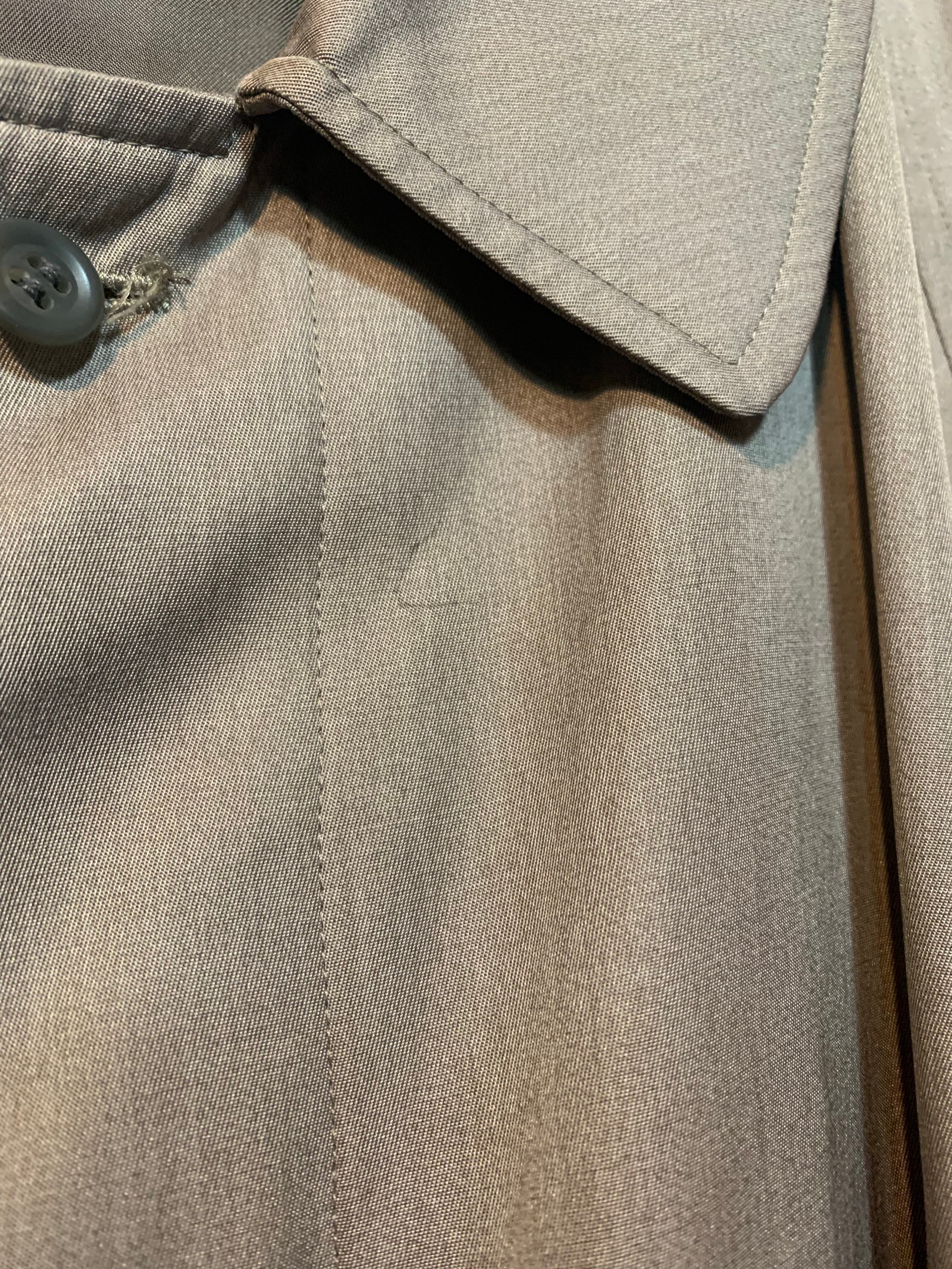 春も冬も使えるモスグリーンカラーのステンカラーコート。