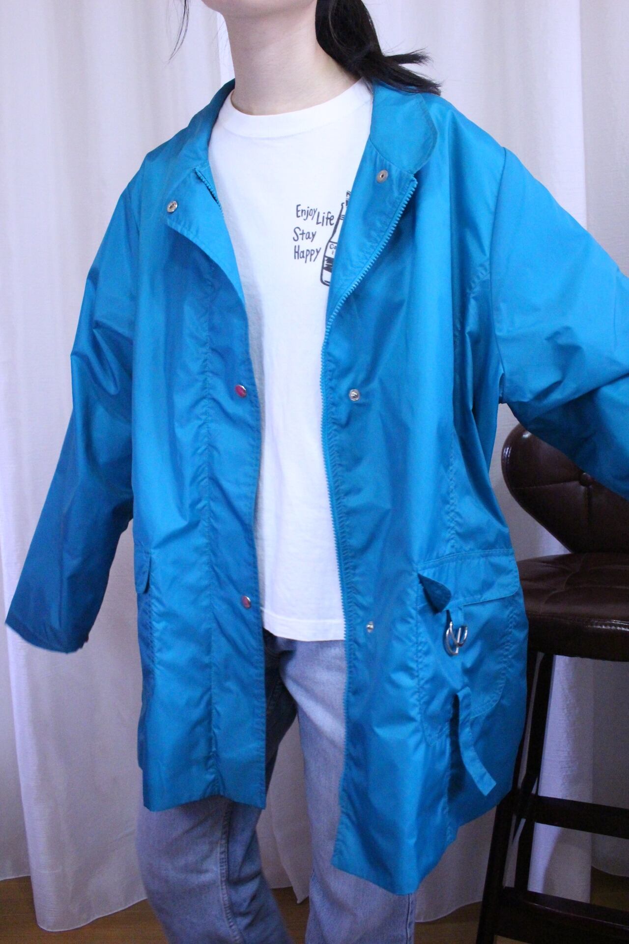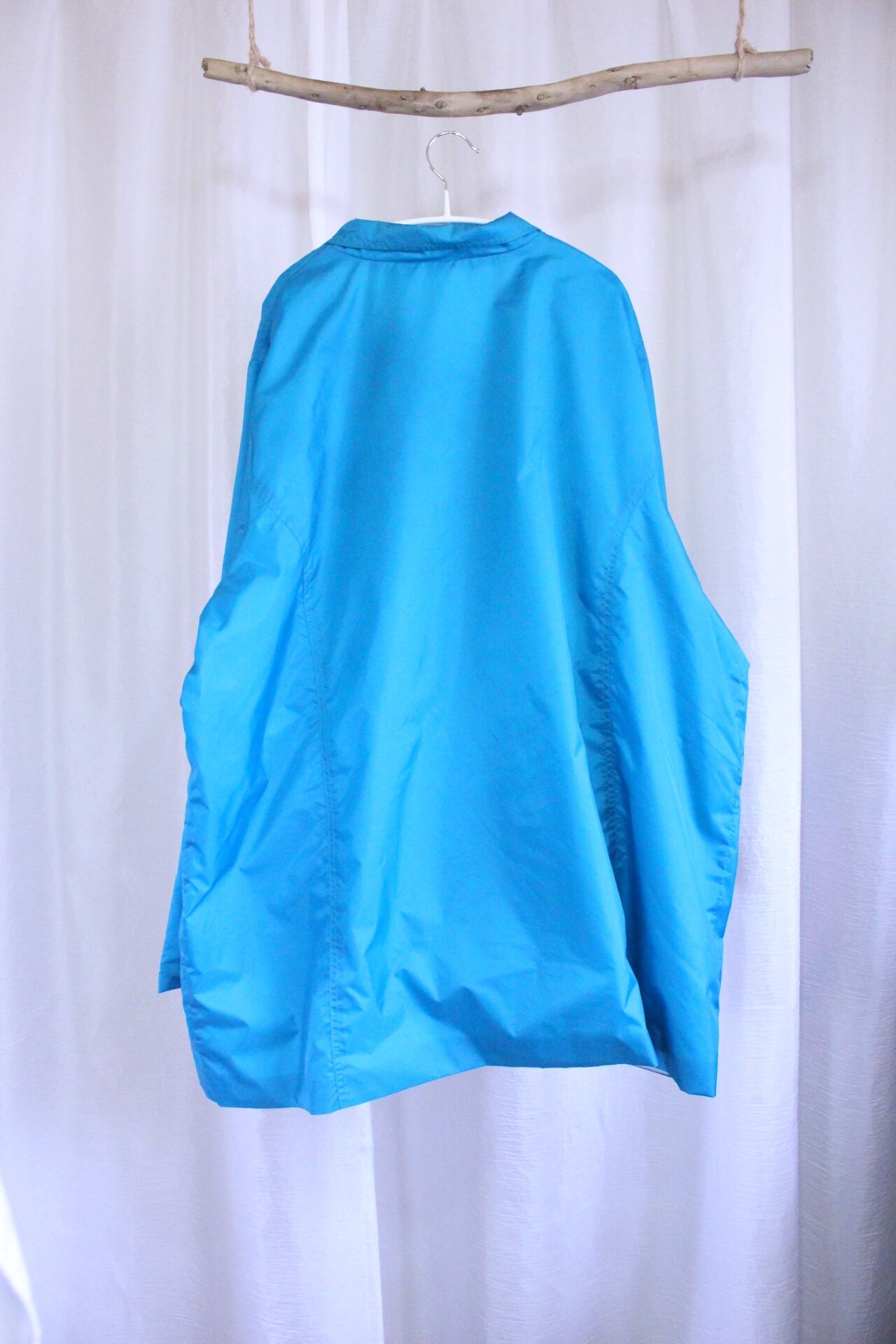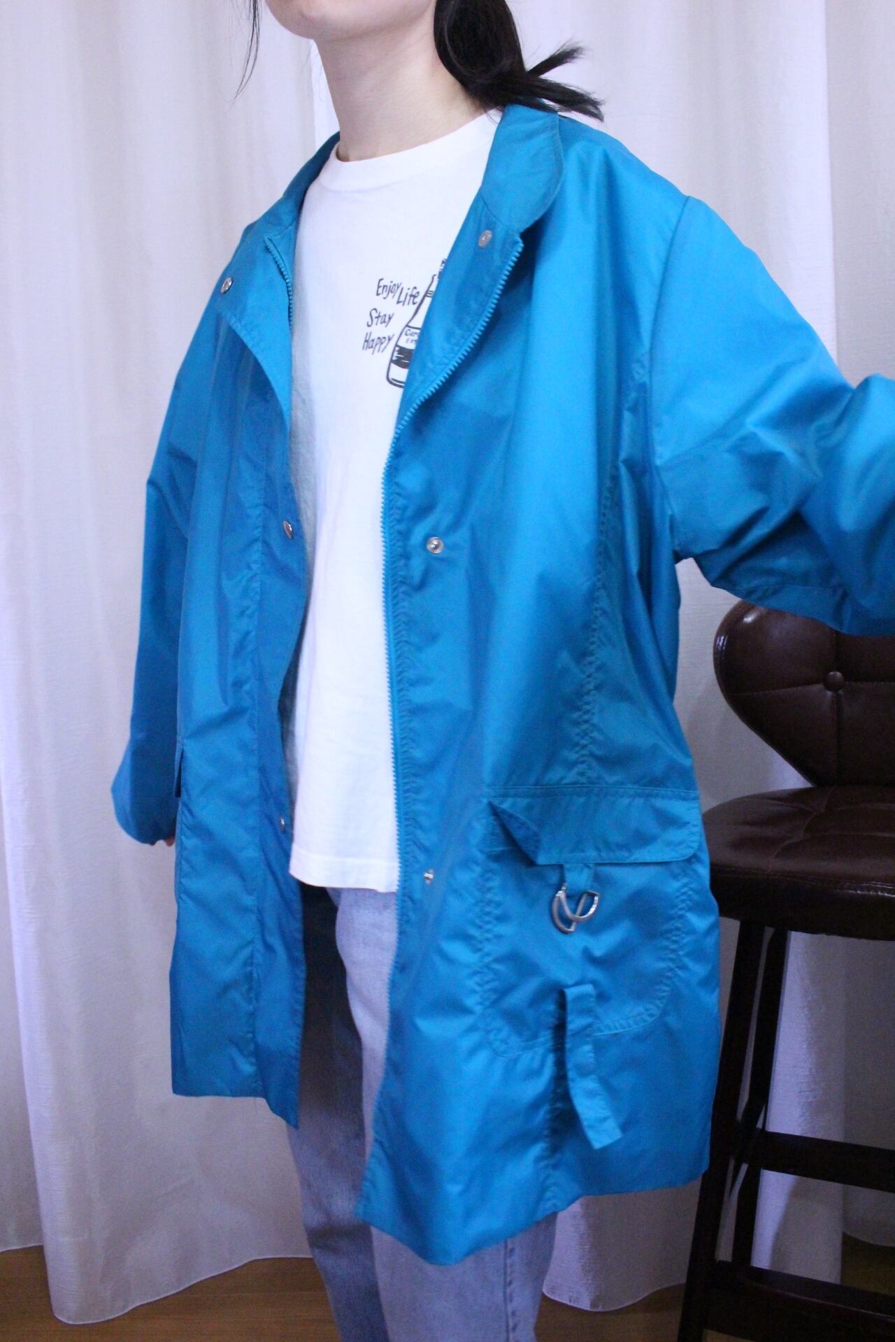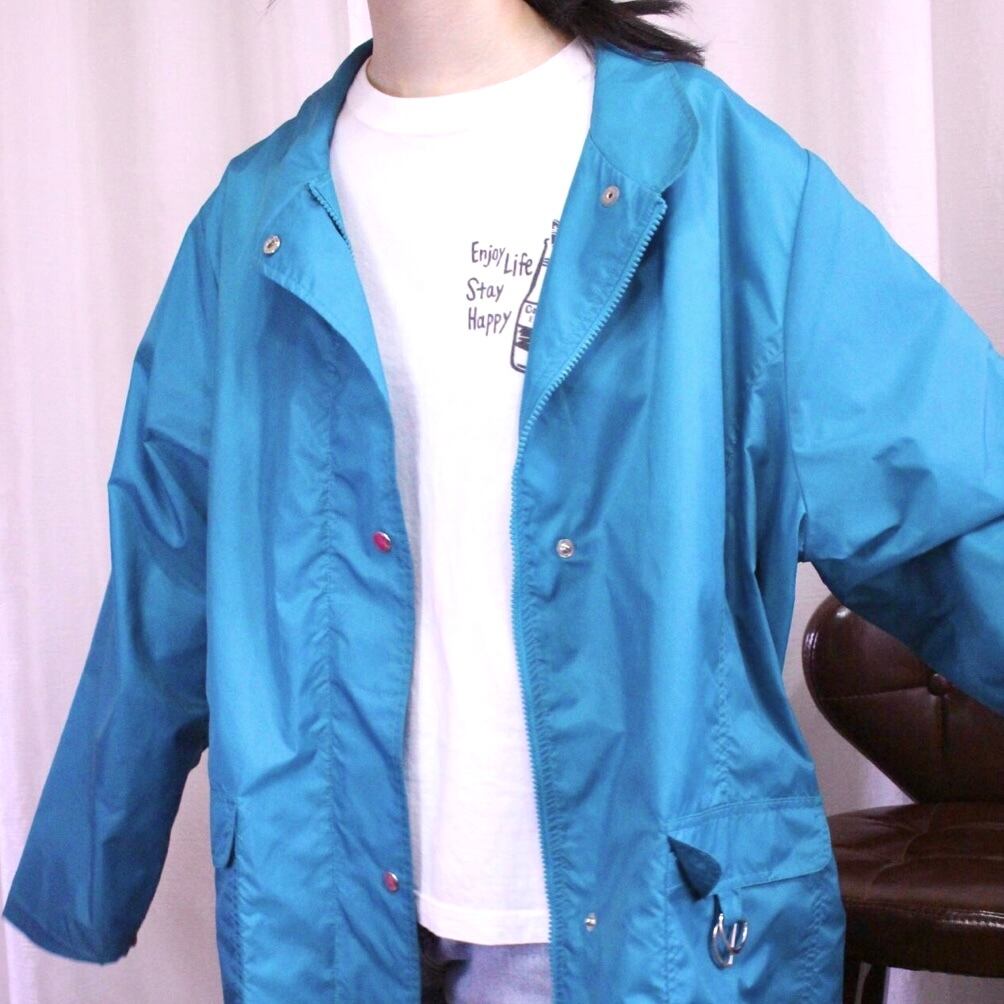 鮮やかなターコイズブルーのナイロンジャンパー。
