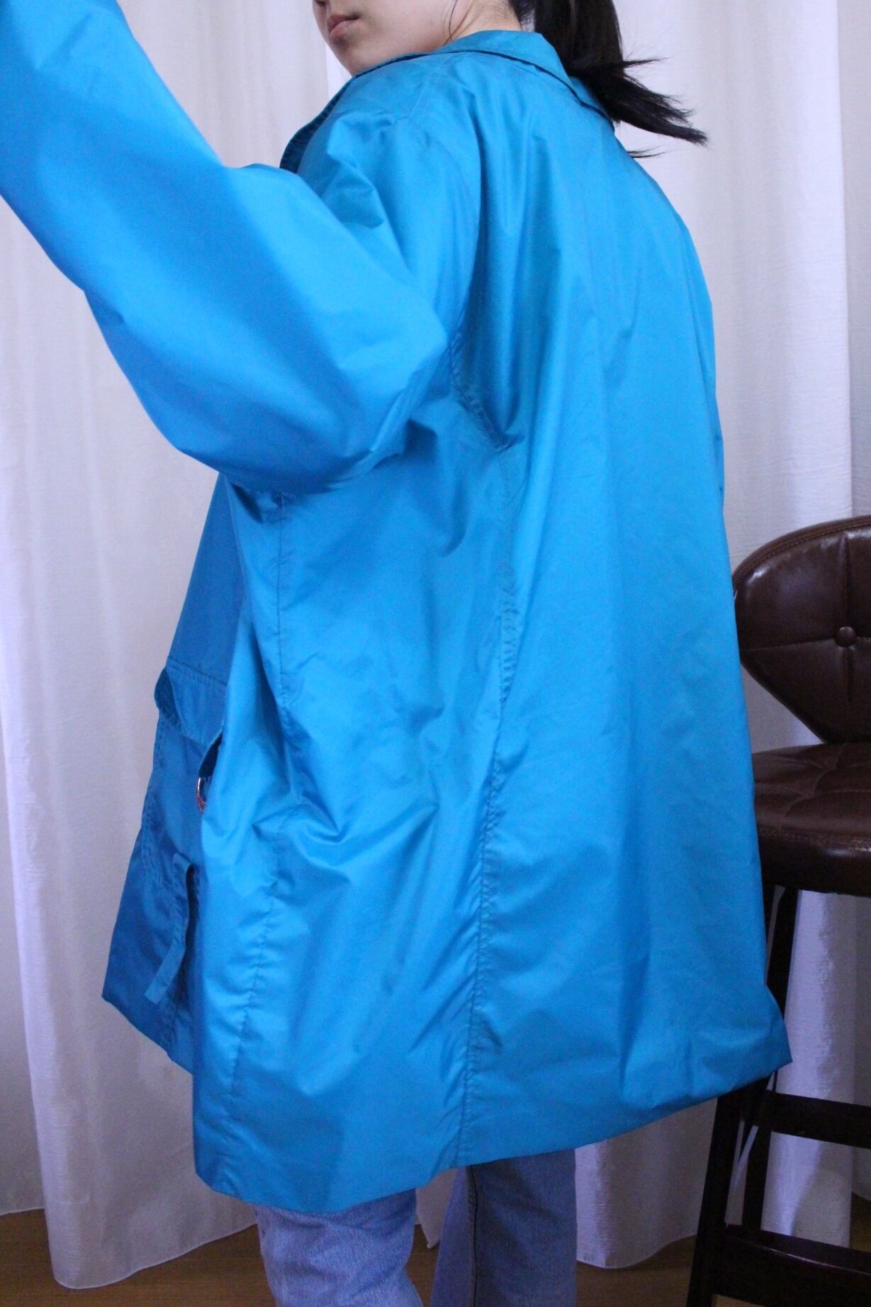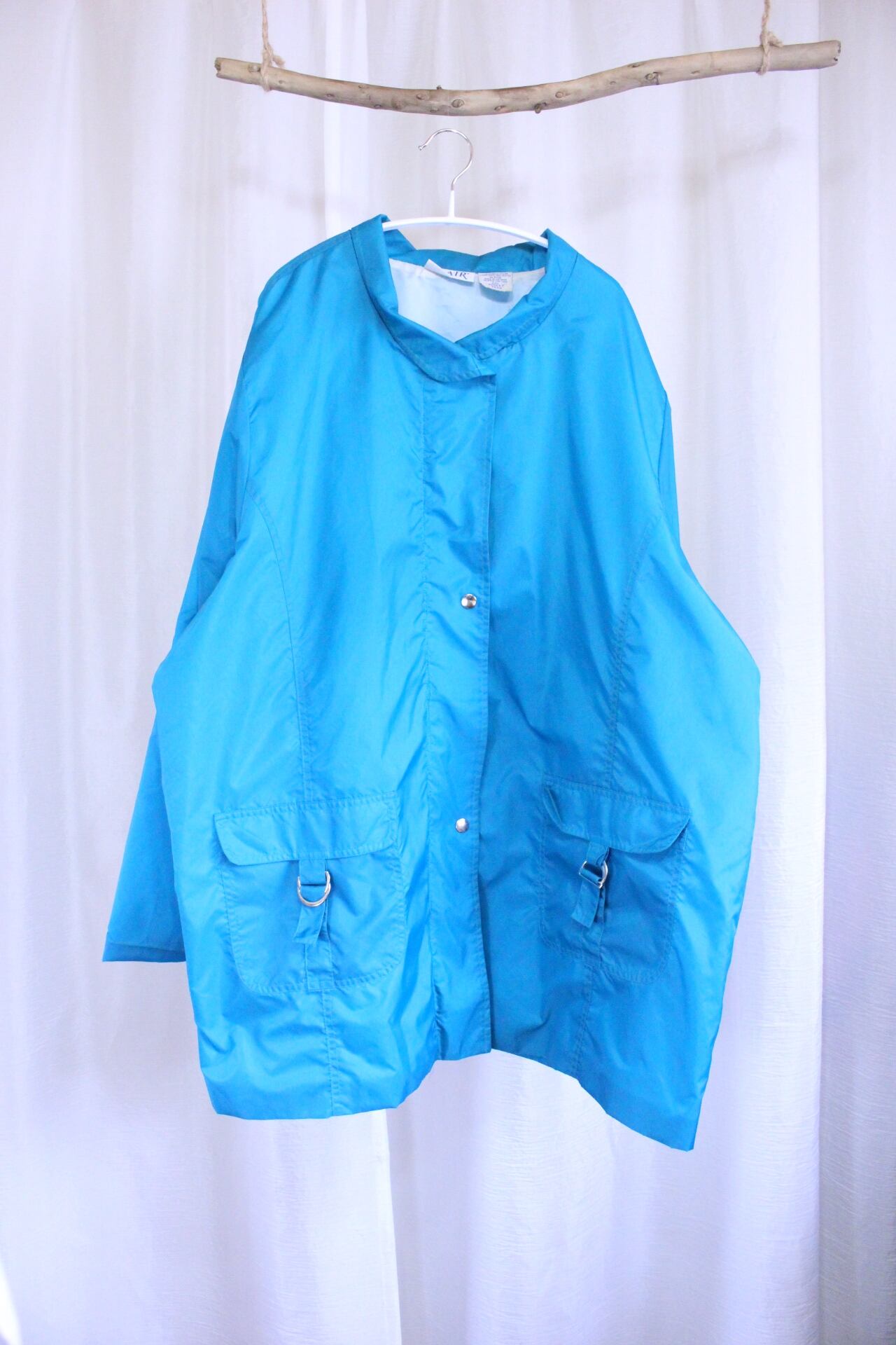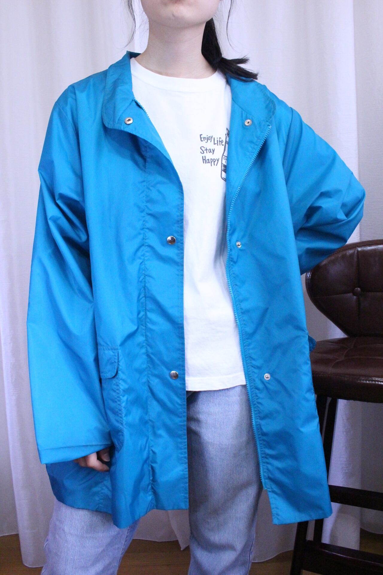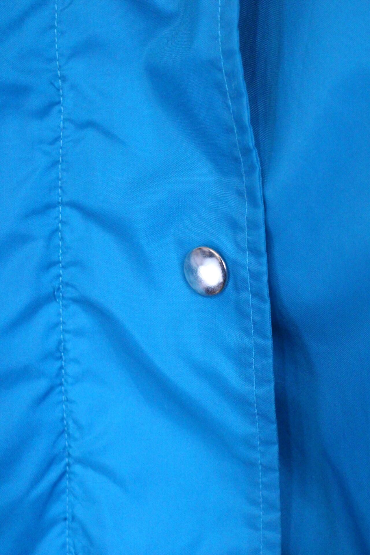 鮮やかなターコイズブルーのナイロンジャンパー。