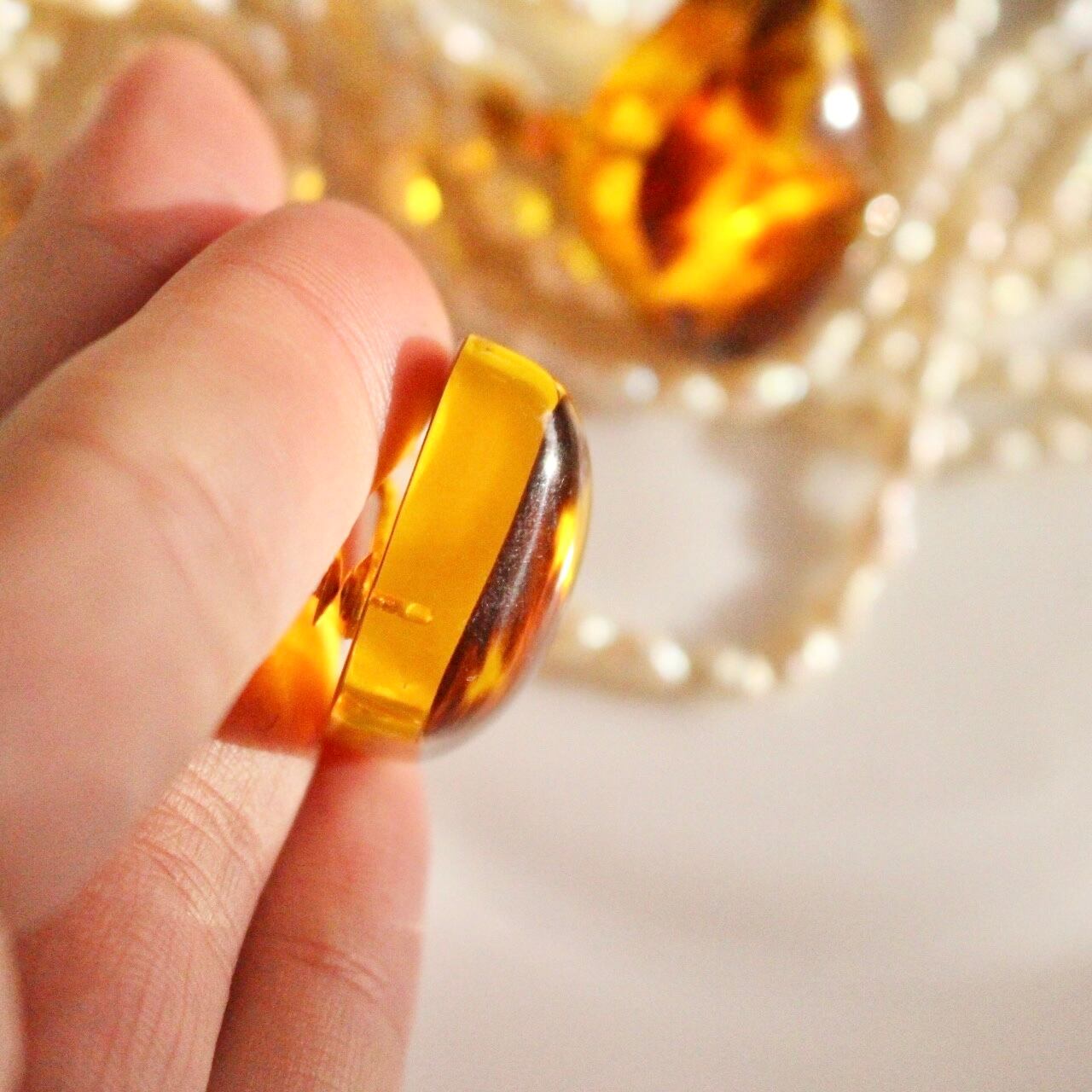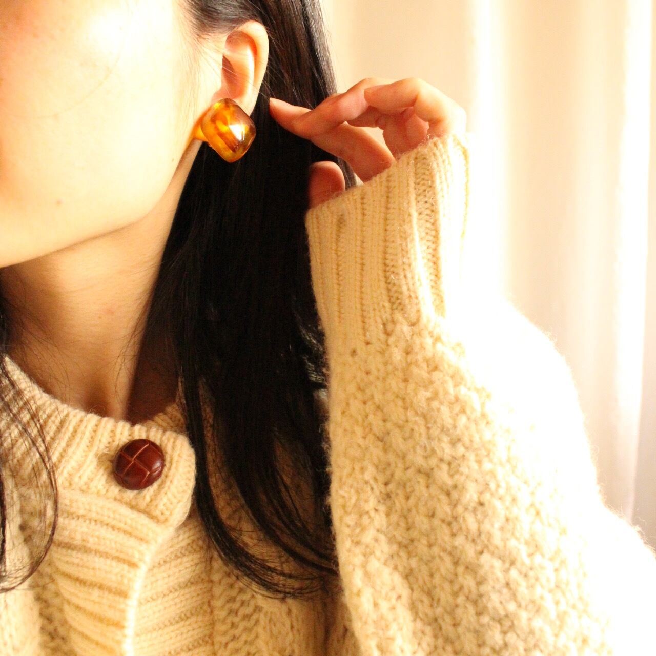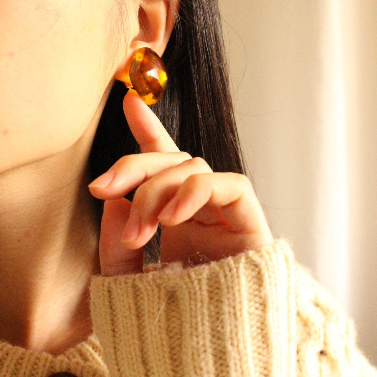 ぷっくり可愛いカタチで、透き通る輝きの琥珀色イヤリング。