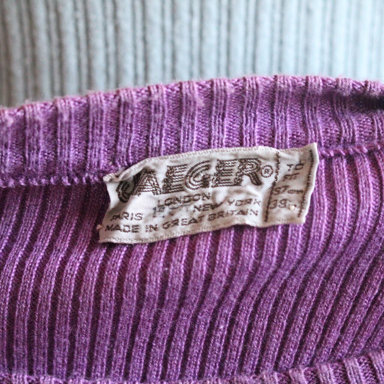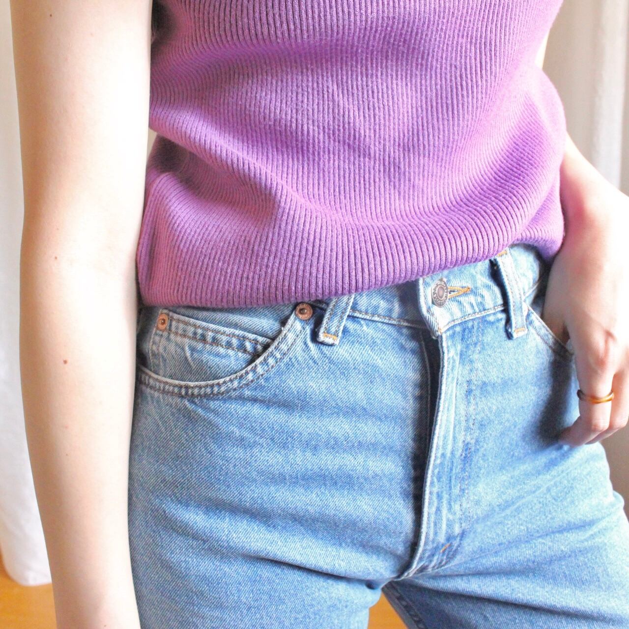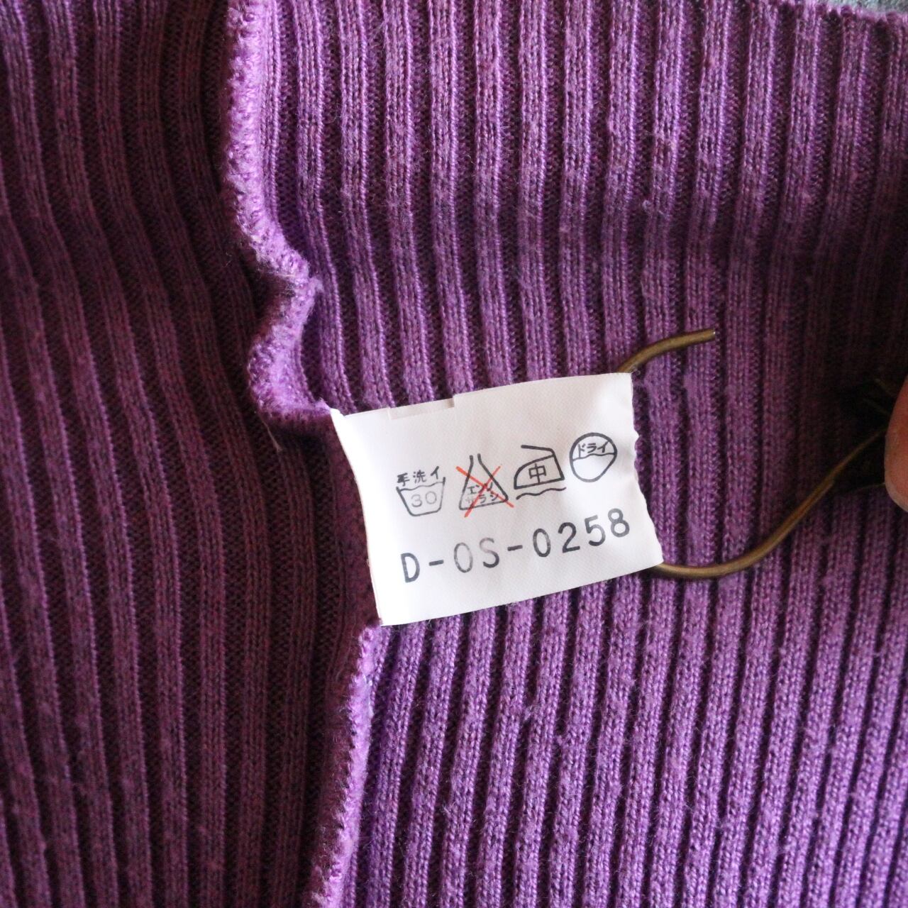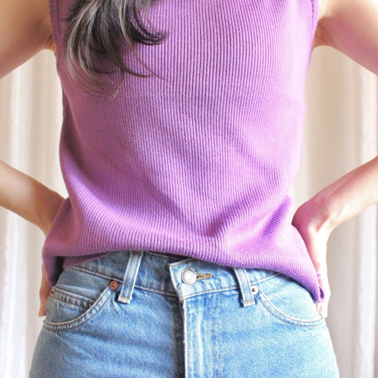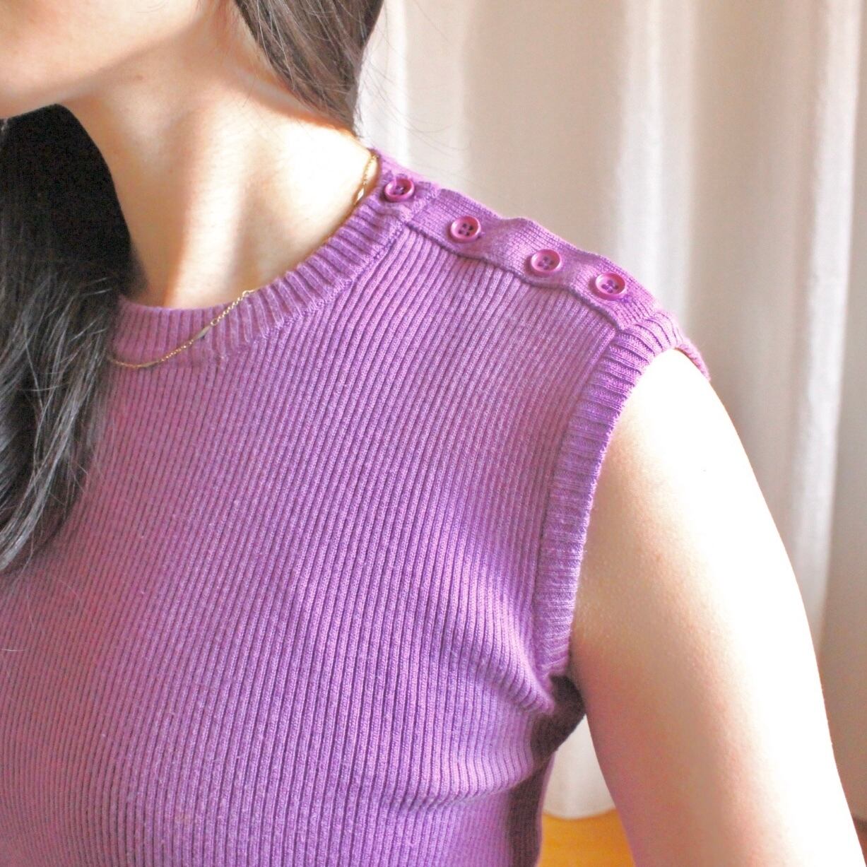 手触りが良く、パキっとしたパープルが発色の良いノースリーブニット。