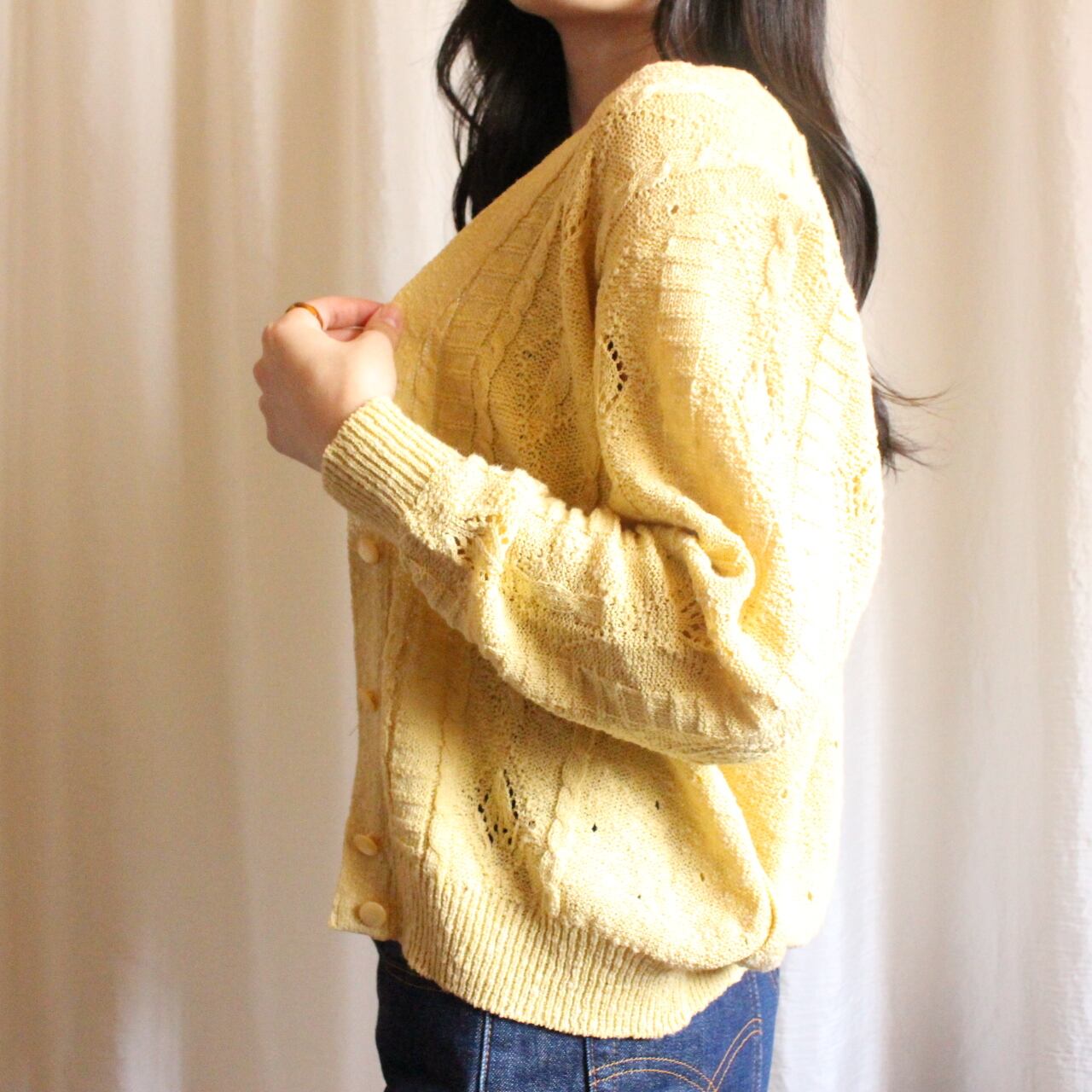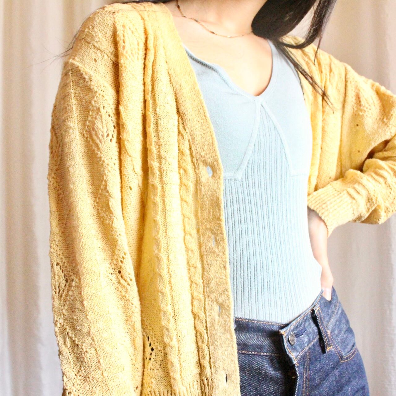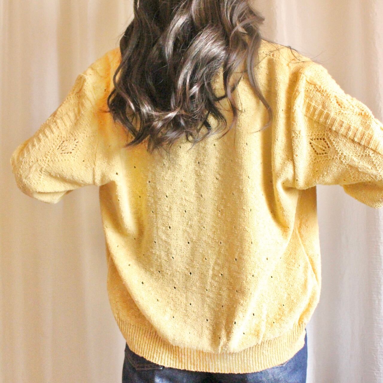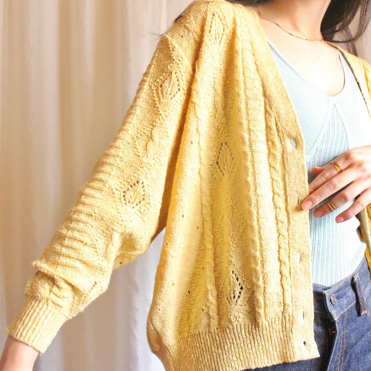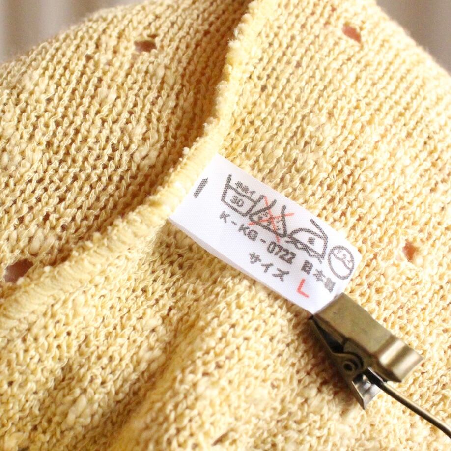 淡いイエローカラーに数種類の編み模様がミックスされたサマーニット。