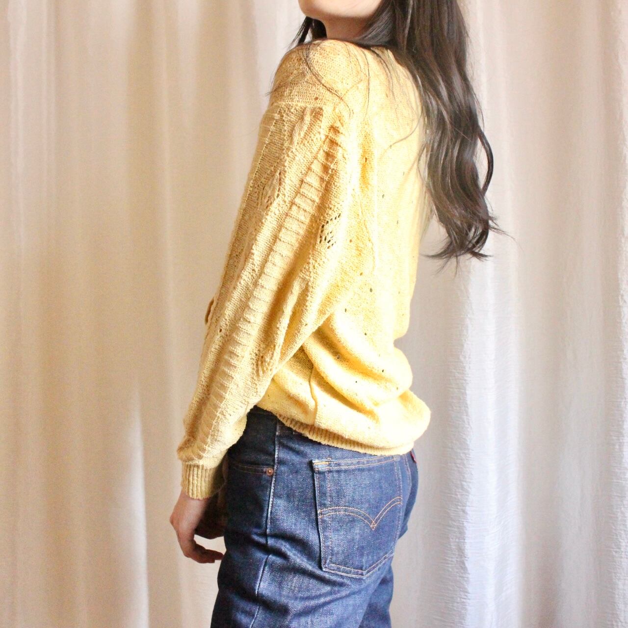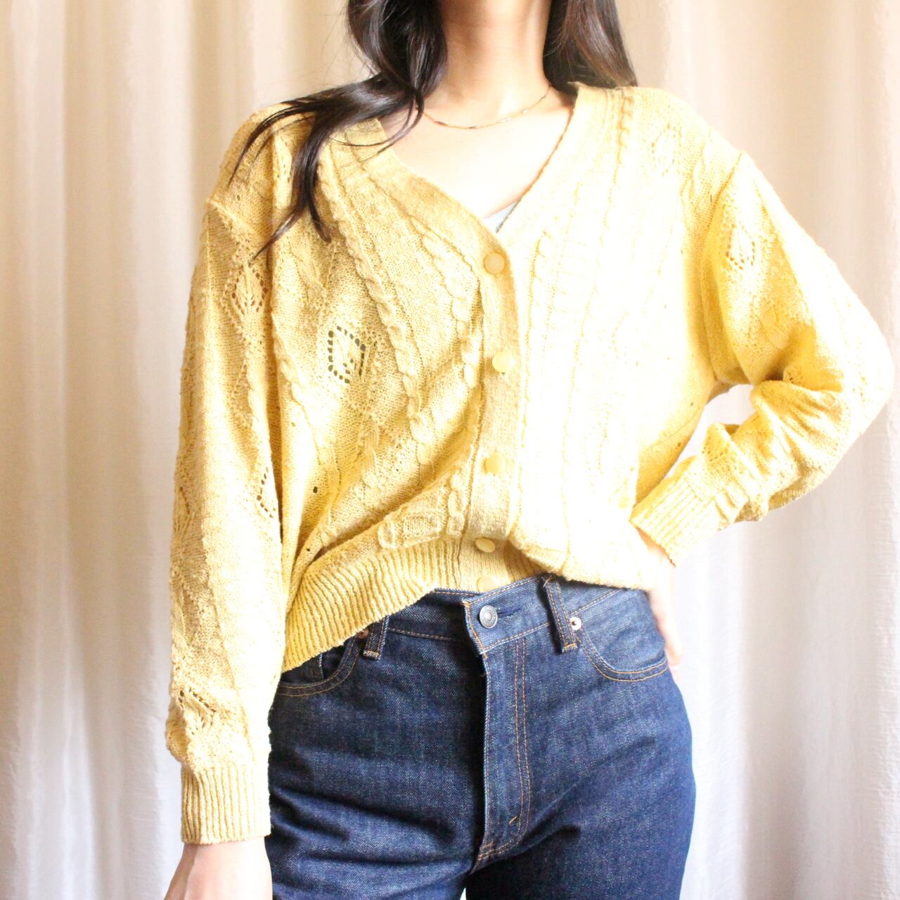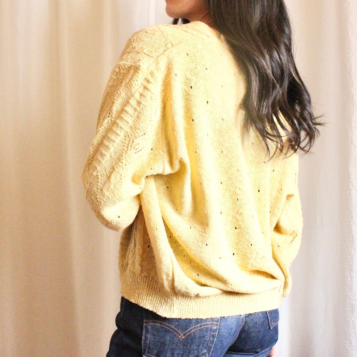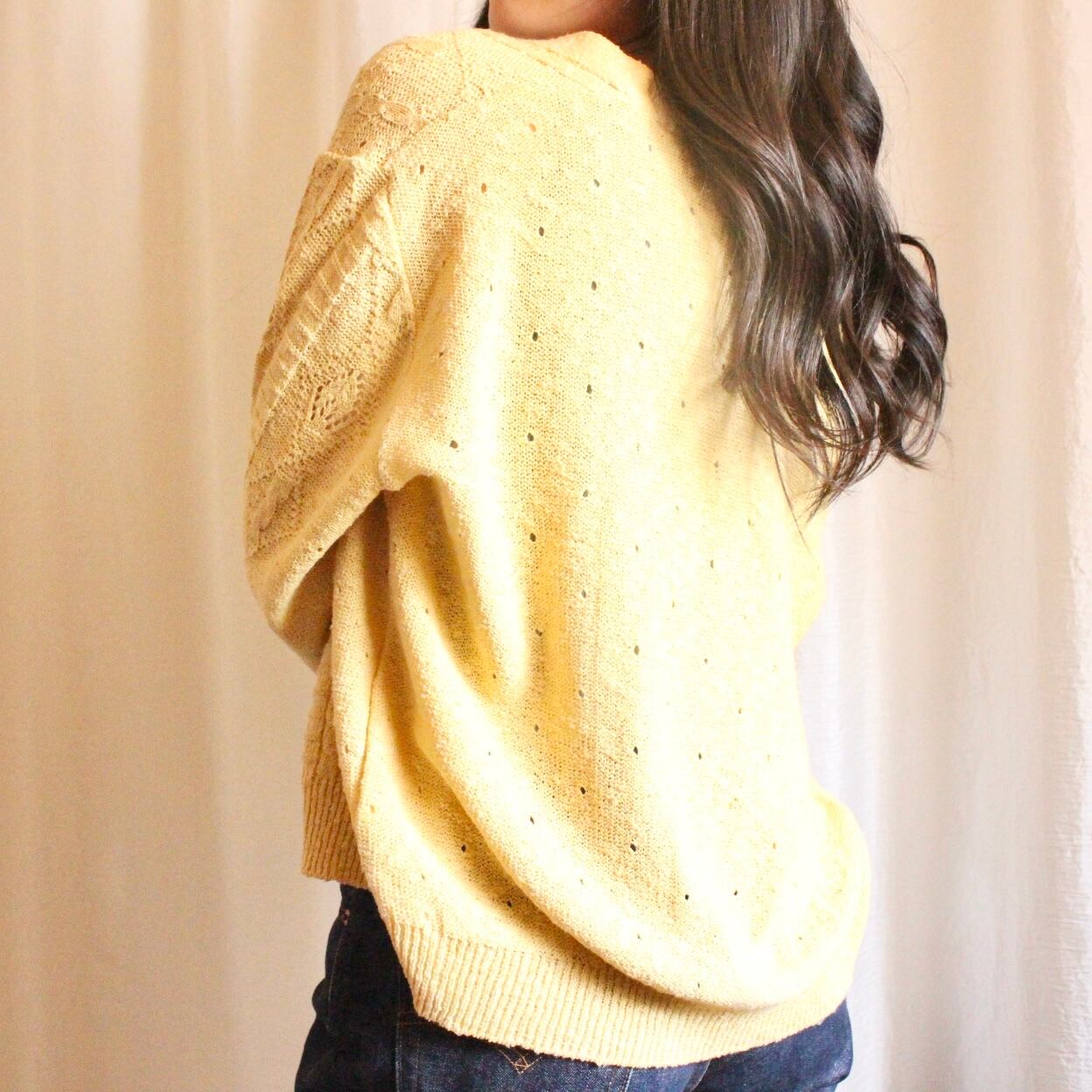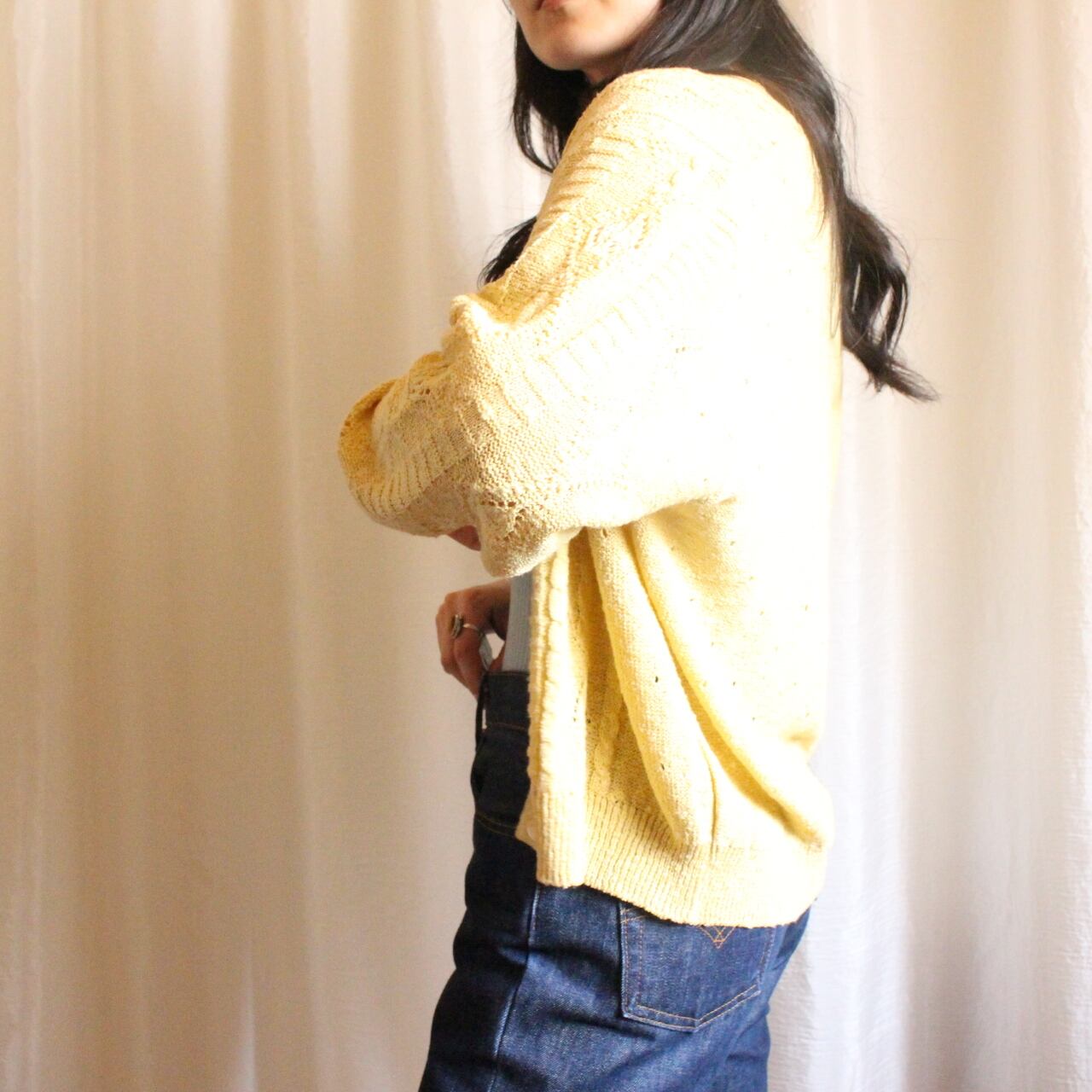 淡いイエローカラーに数種類の編み模様がミックスされたサマーニット。