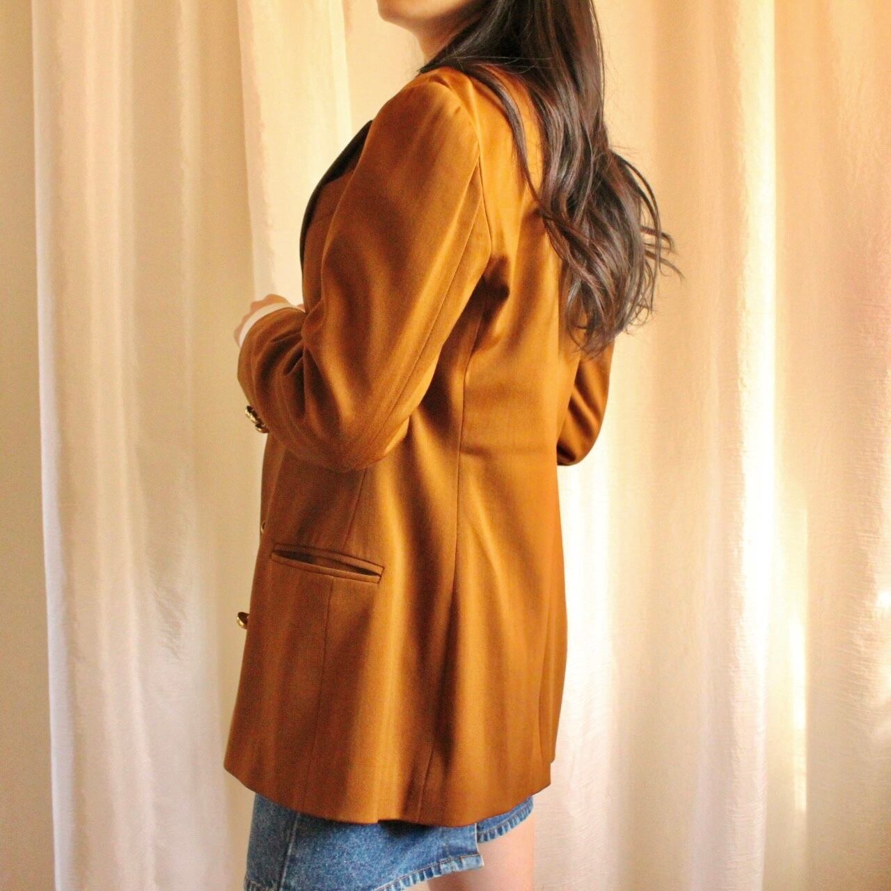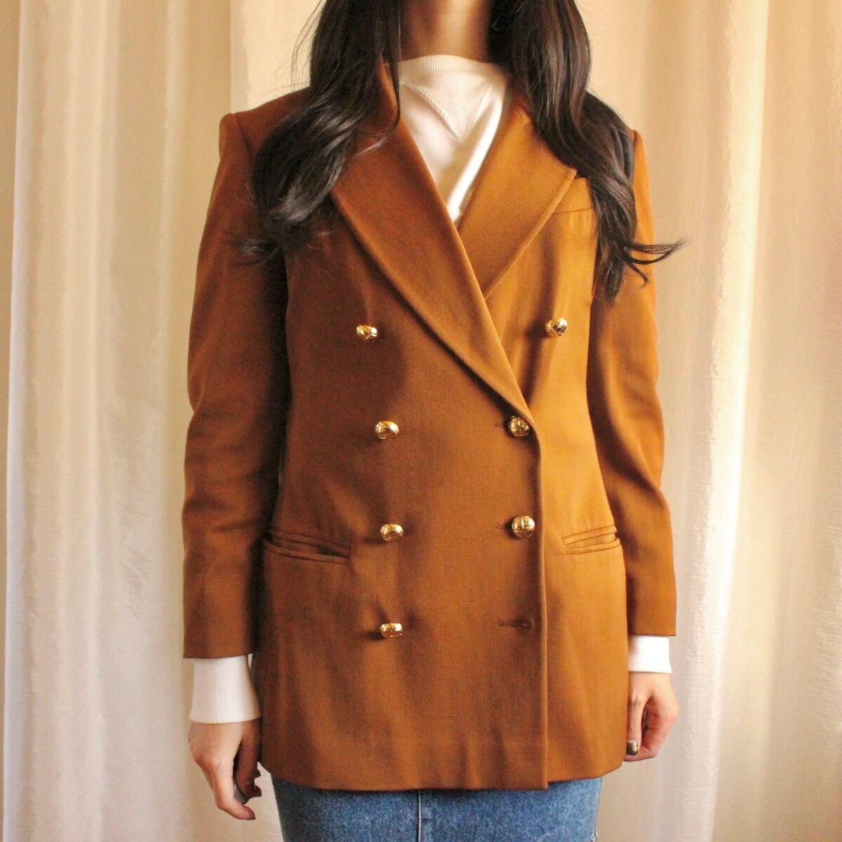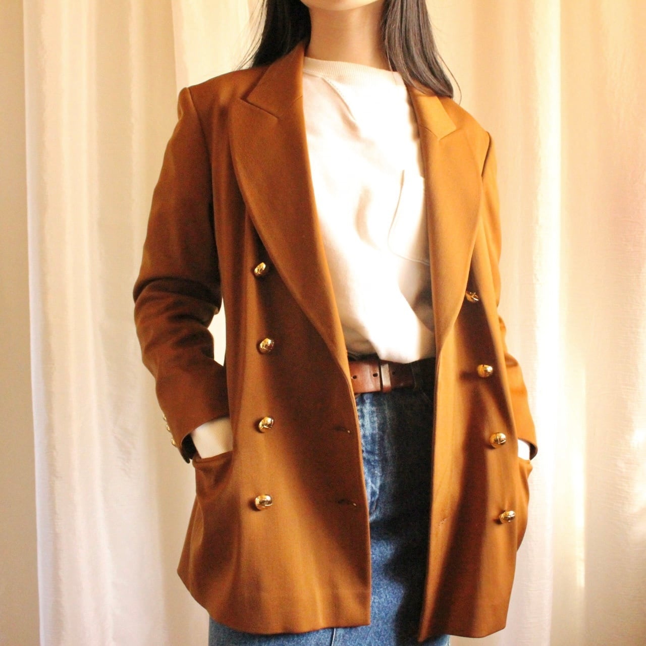 きらりと光るゴールドのボタンが特徴的なチョコレートブラウンカラーのダブルジャケット。