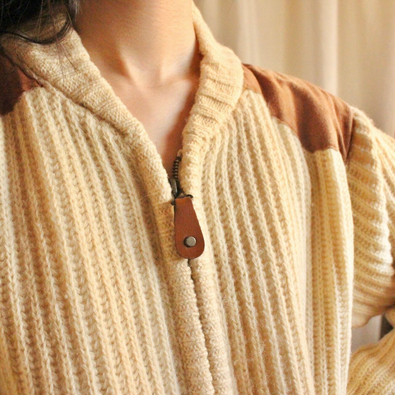 クリームホワイトのジッパーリブニット。
