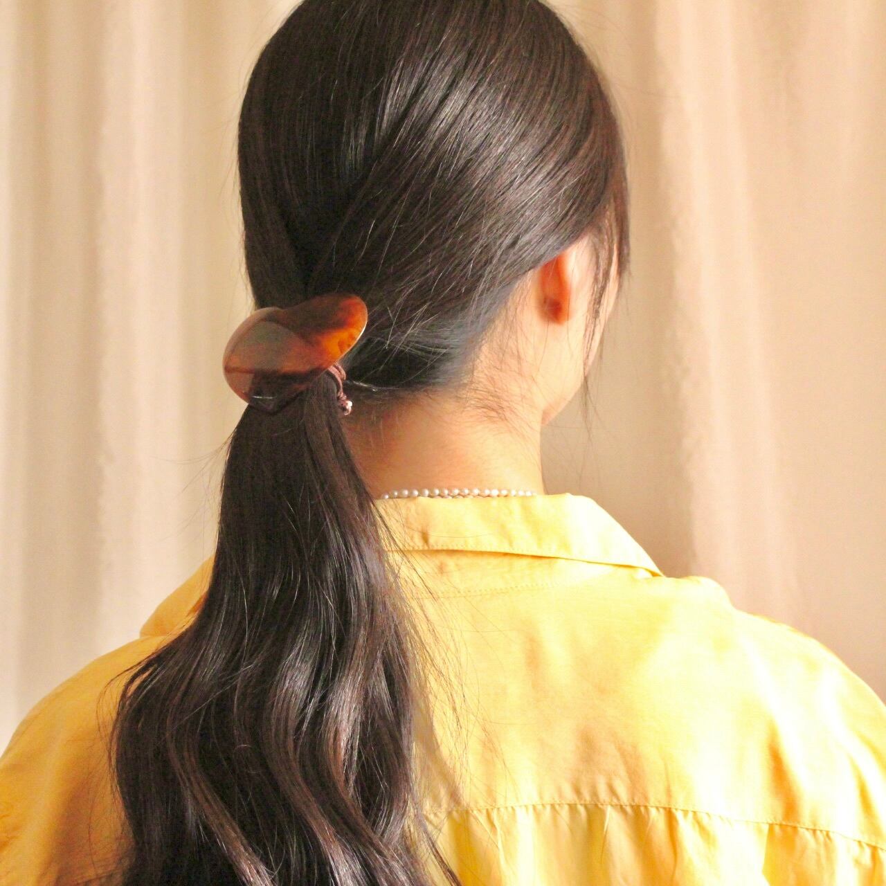 また、ポニーテールやお団子でも表面の髪を少しすくって束ねたゴムを隠すようにバレッタを留めると、毛量に関係なくお使いいただけます。