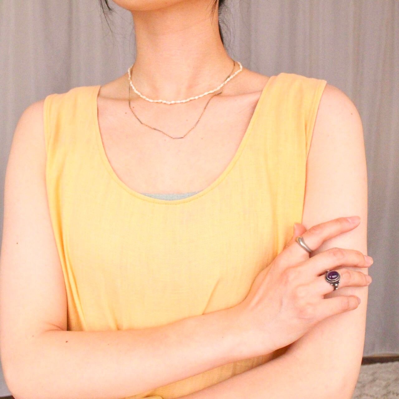 柄物、色モノのキャミソールやタンクトップを中からチラ見せして、レイヤードをお楽しみいただけます◎