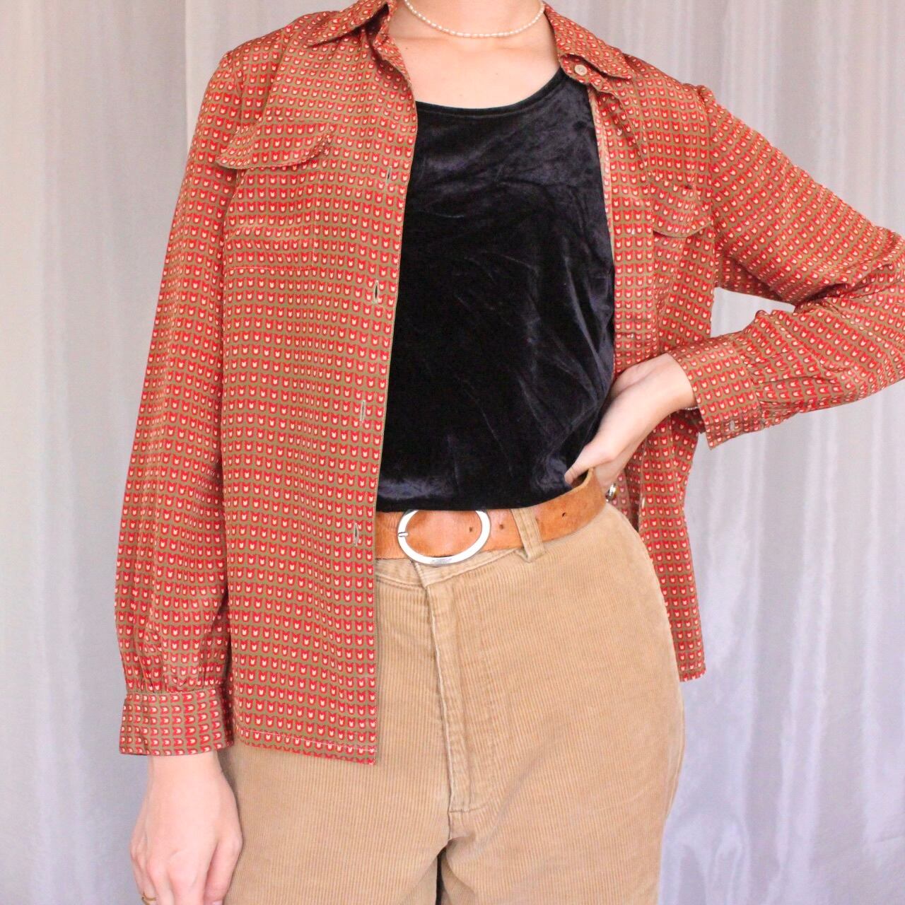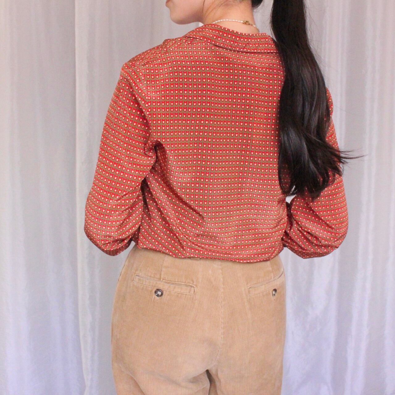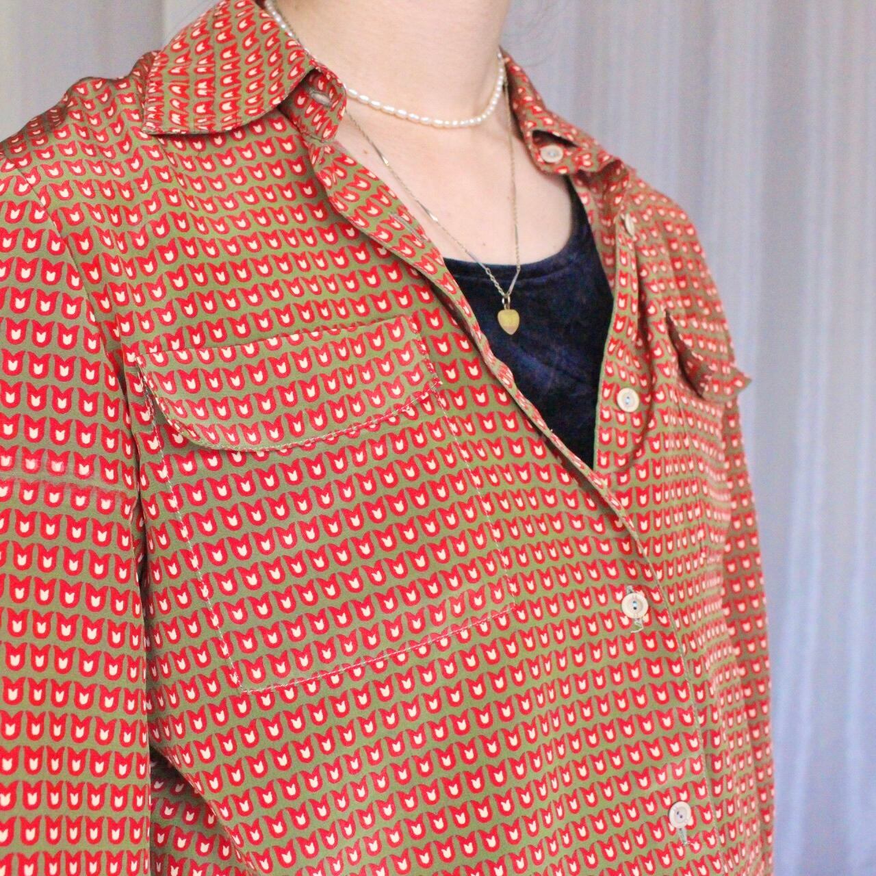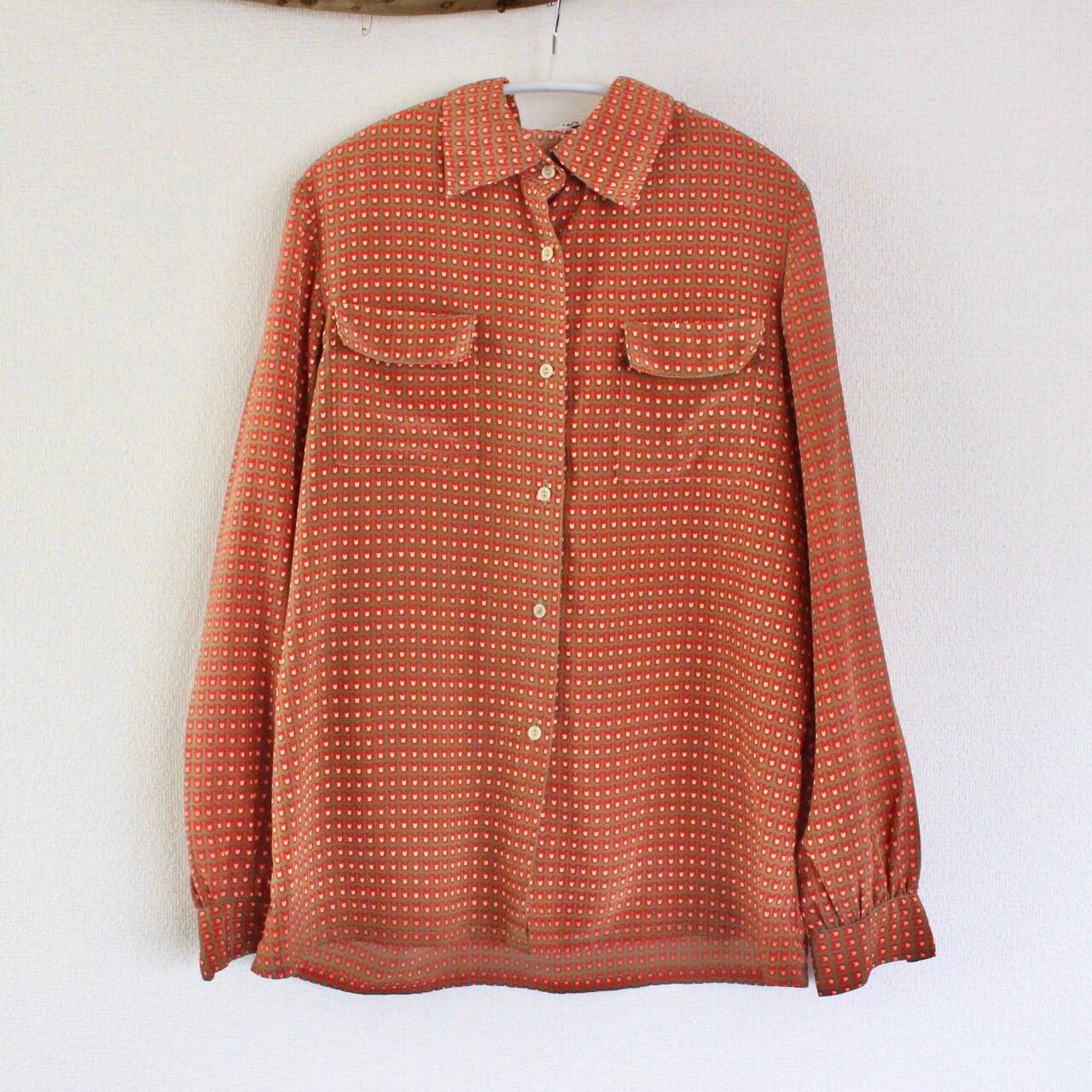 こっくりとした朱色にグリーンのドット柄が印象的なシャツ。