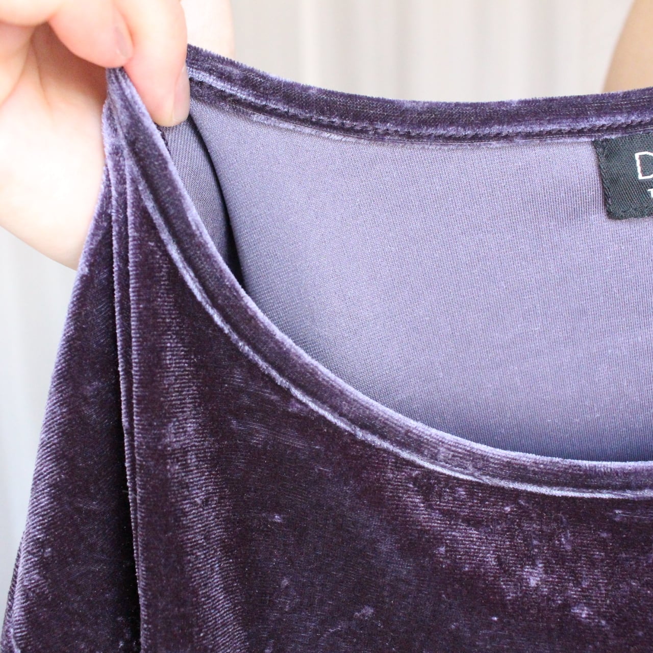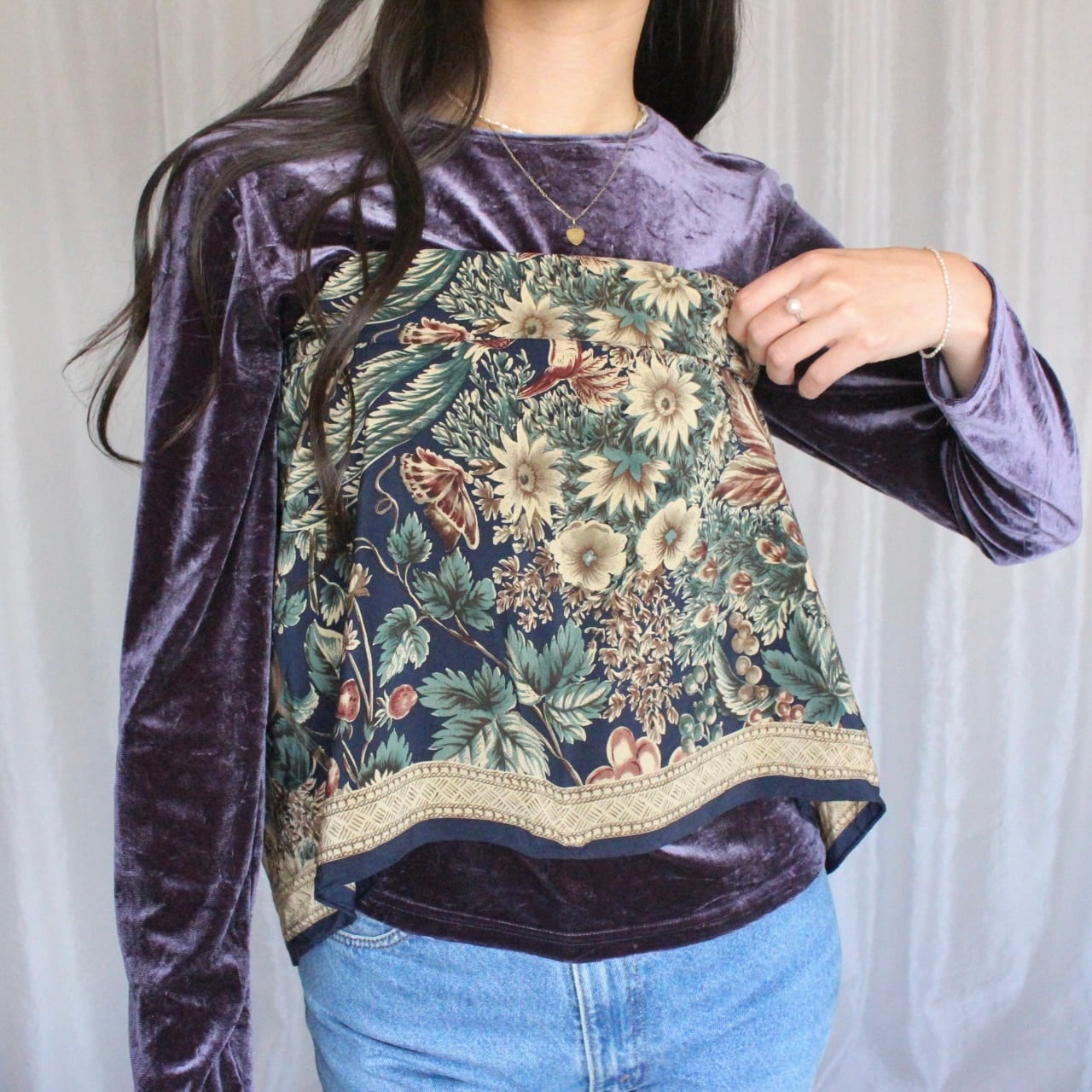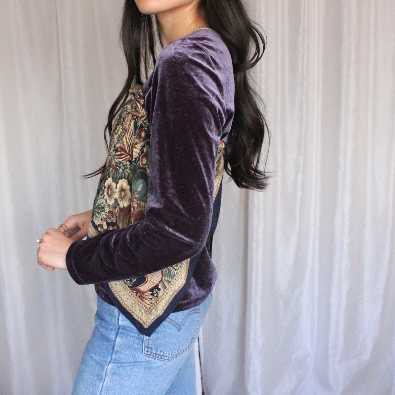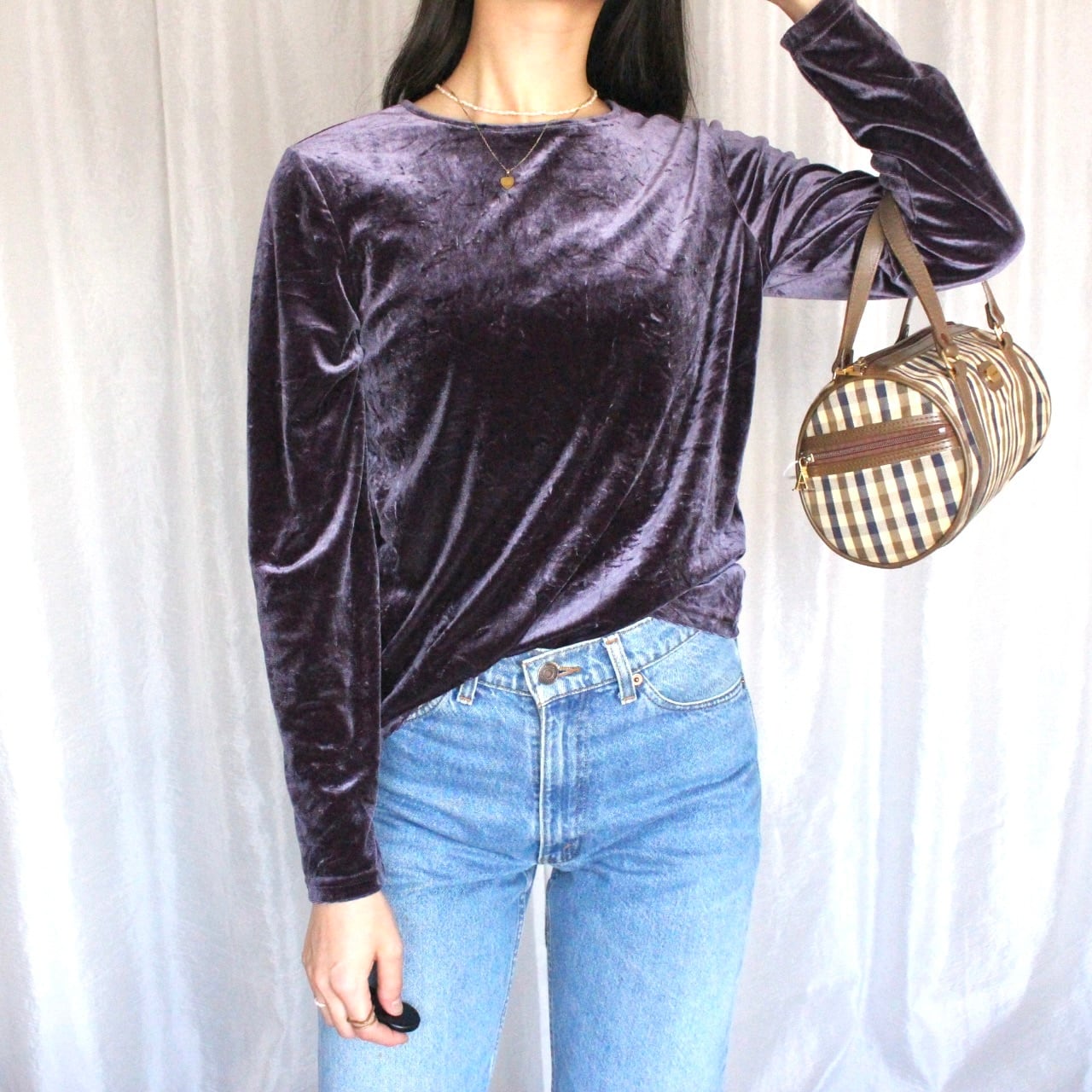秋冬の重ね着をしても、一着でも存在感がありばっちりキマるパープルのベロアトップス。