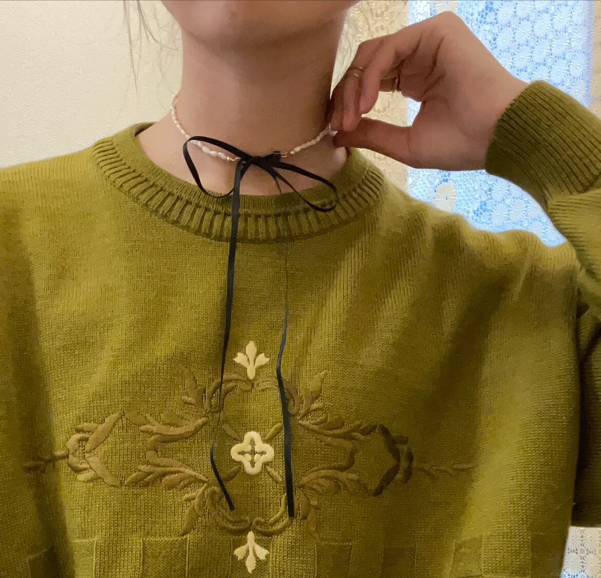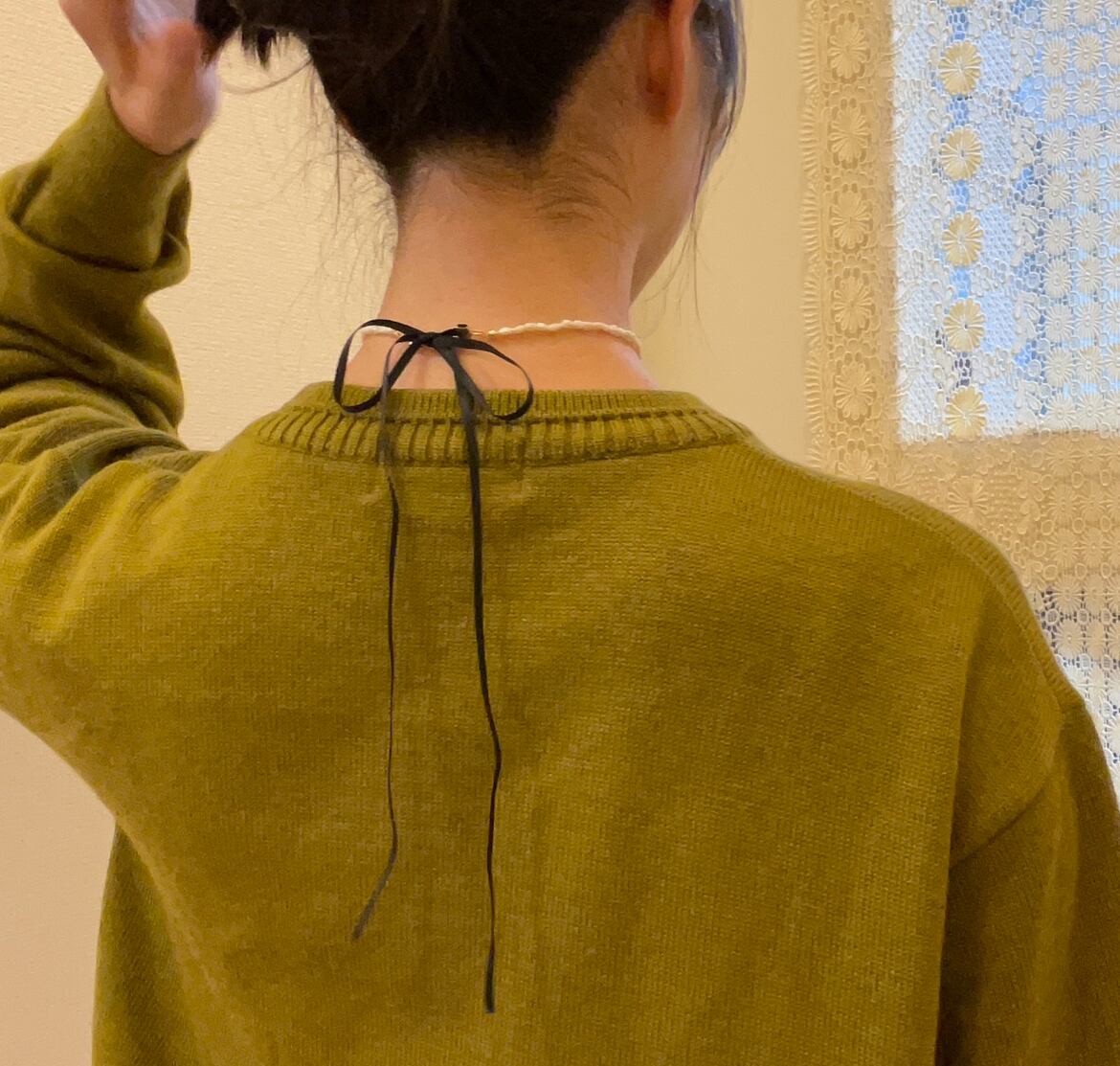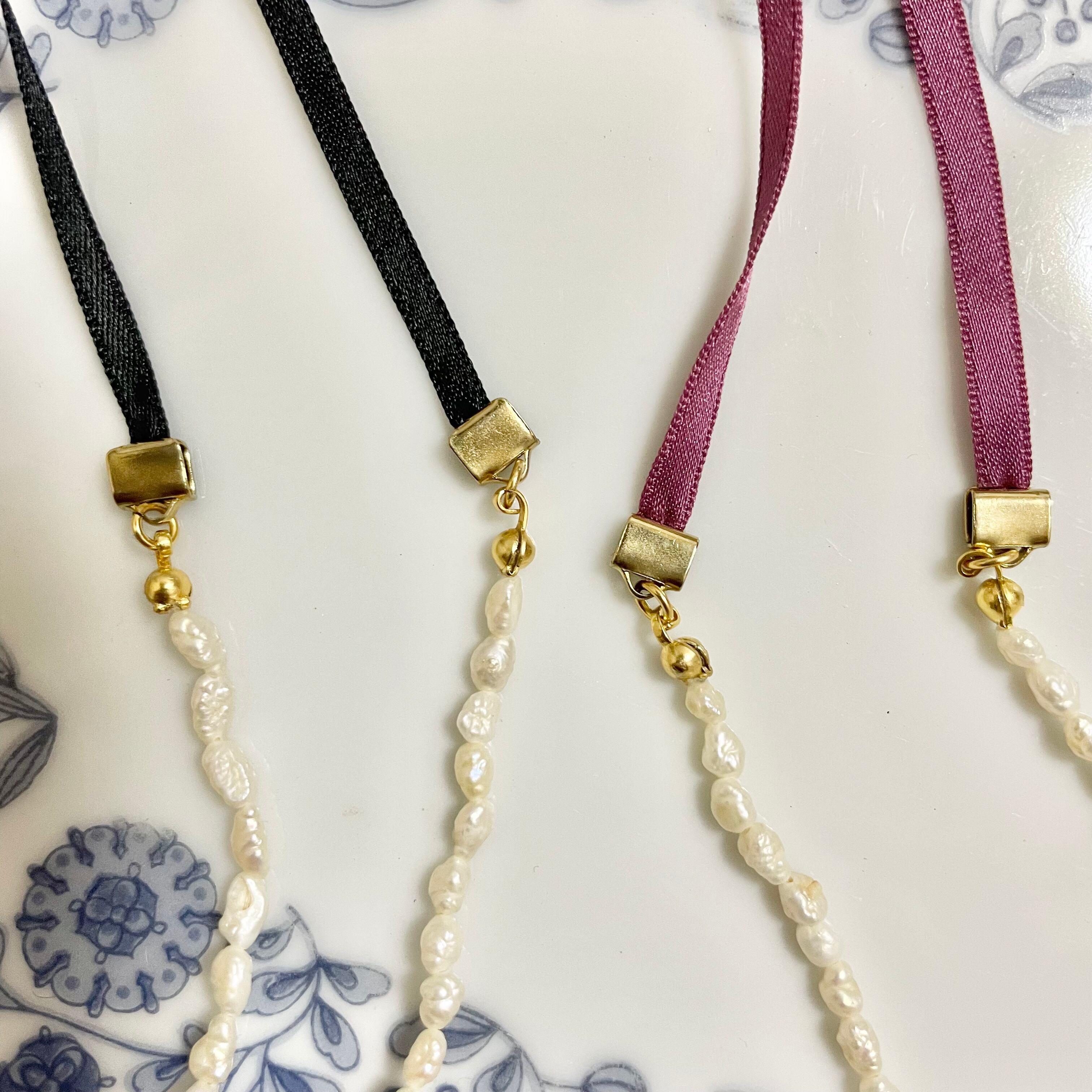 リボンで結んでサイズ調節できるので、きゅっとリボン結びでチョーカー風にも、ゆるっと普段のネックレスのサイズにもできます。