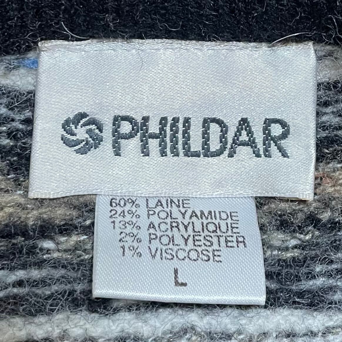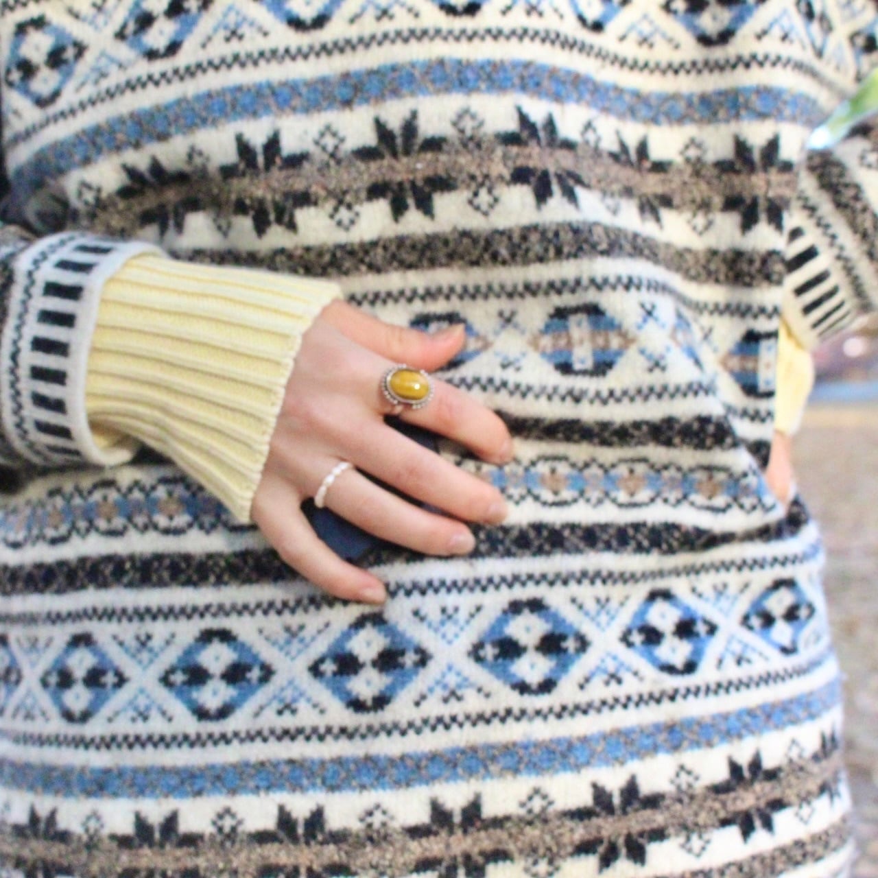 ほっこりするようなノルディック柄がかわいい白地にブルーのニット。