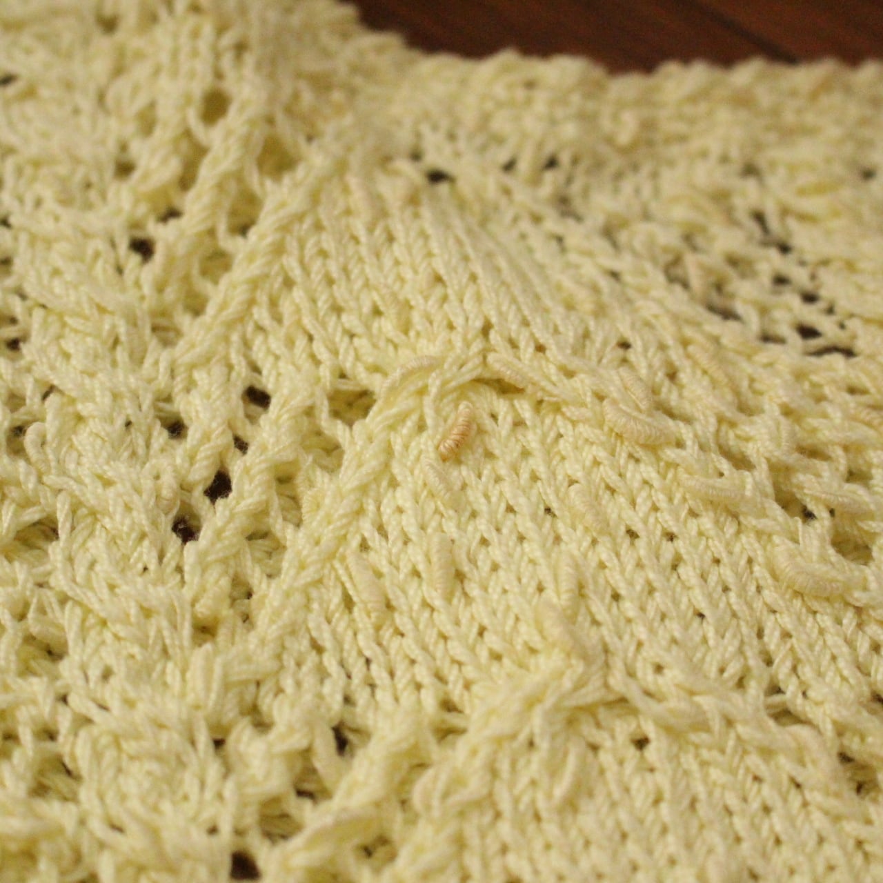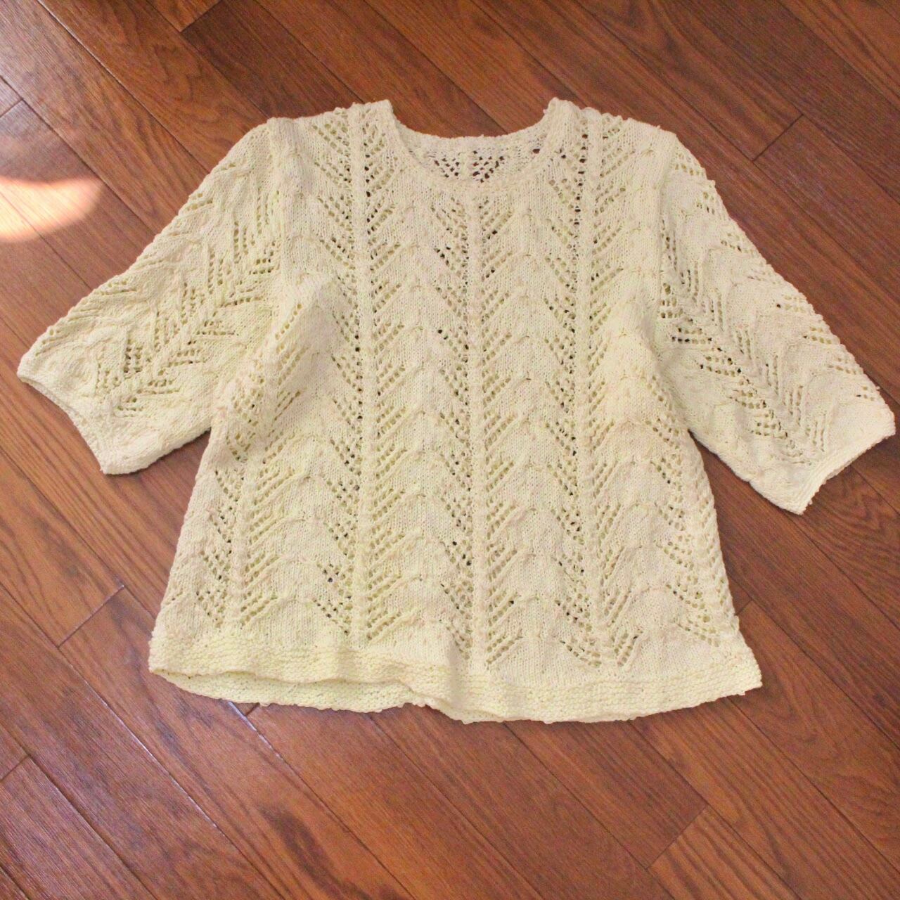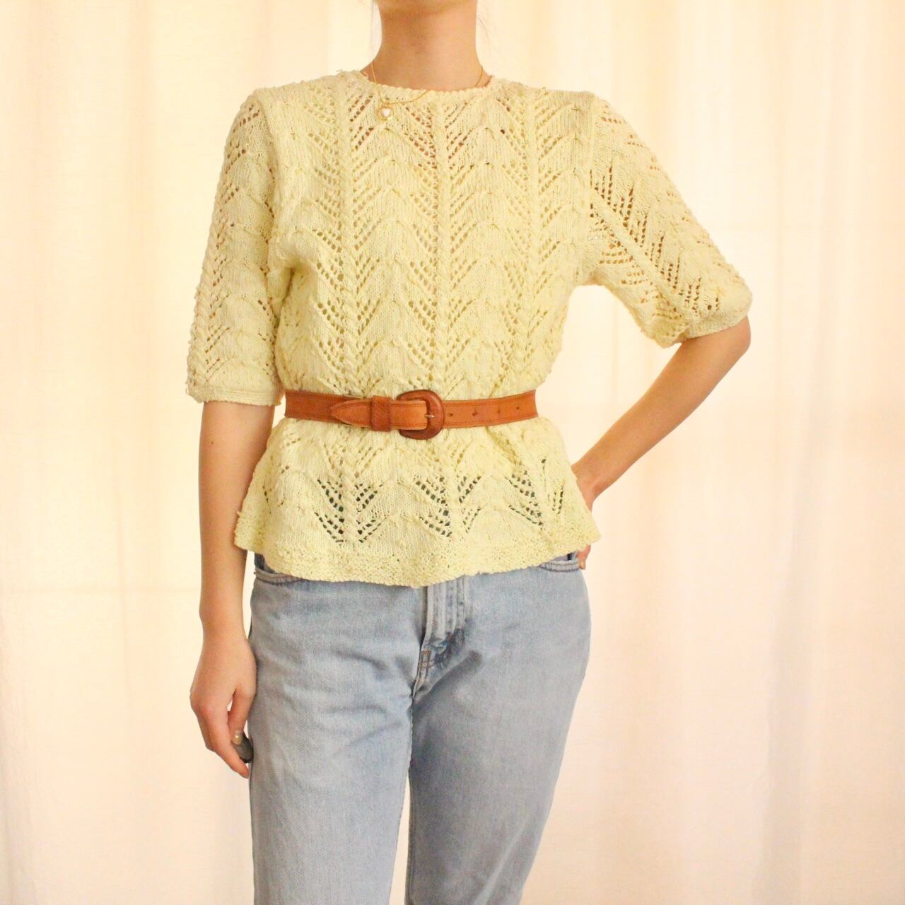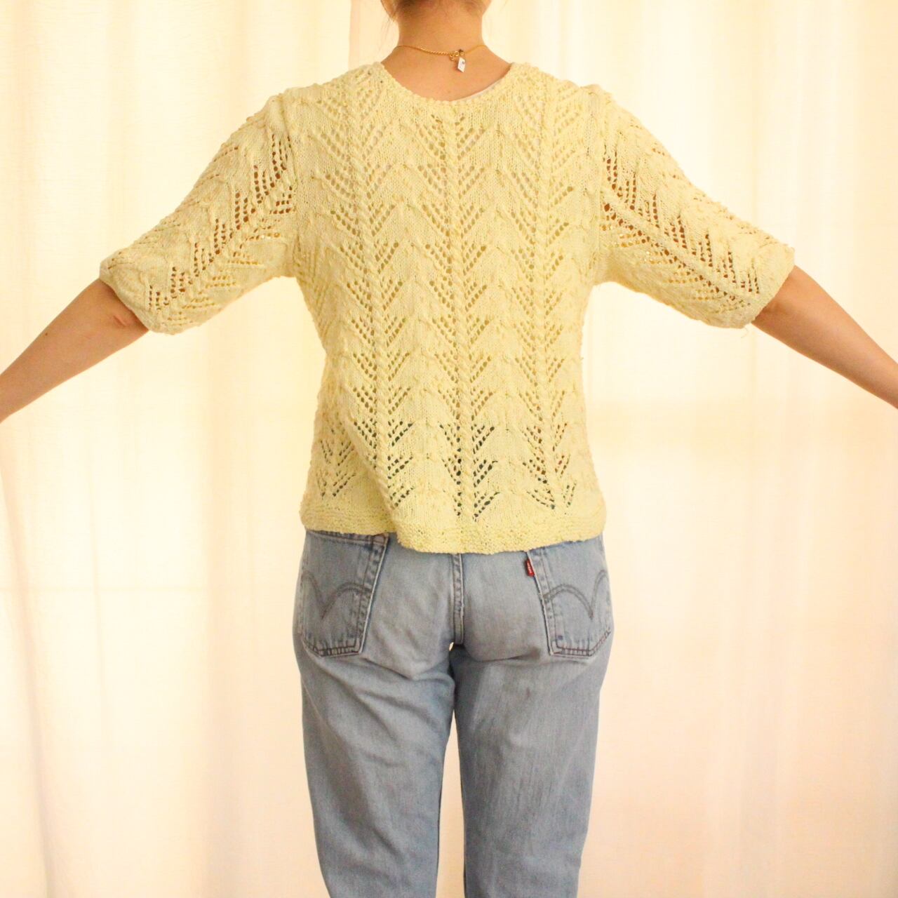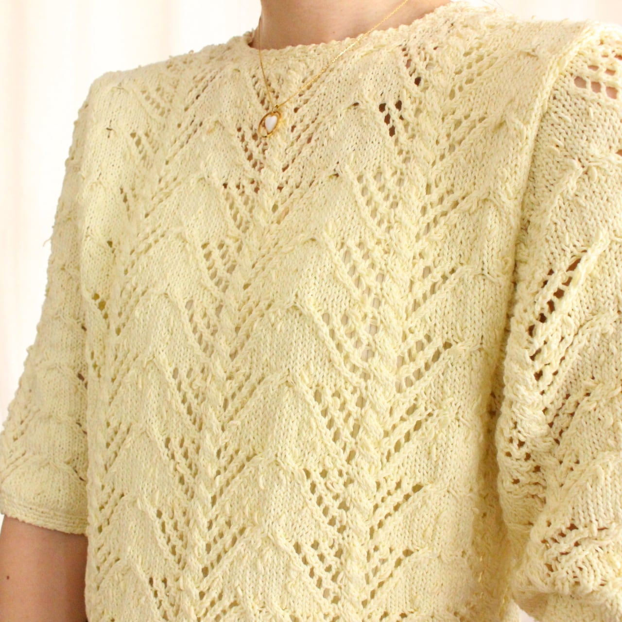 淡いパステルイエローカラーの優しい雰囲気と、ポップな要素がすこし感じられるハンドニット。