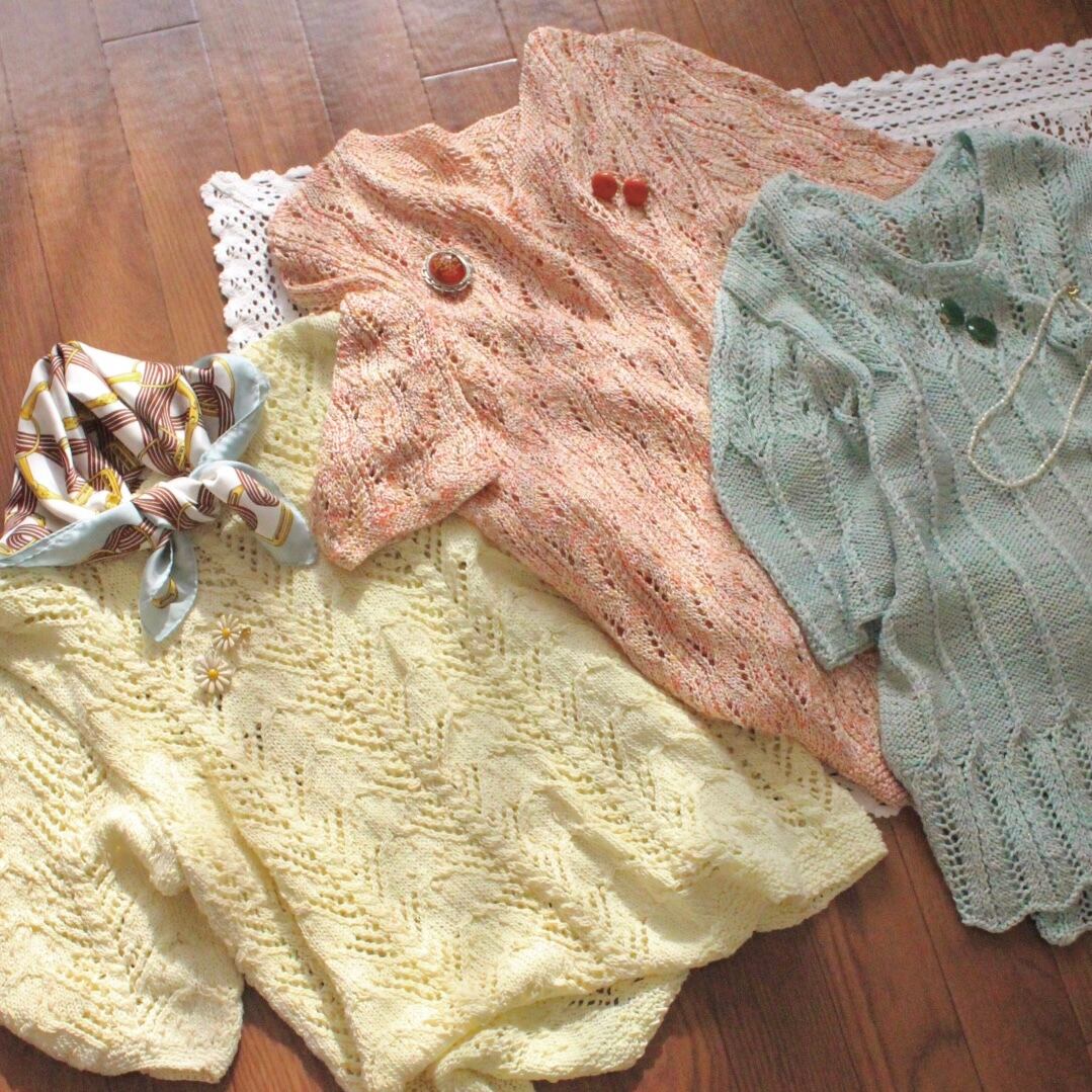 他のハンドニットのミントグリーン、サーモンピンクと並べると一番厚手かと思います。