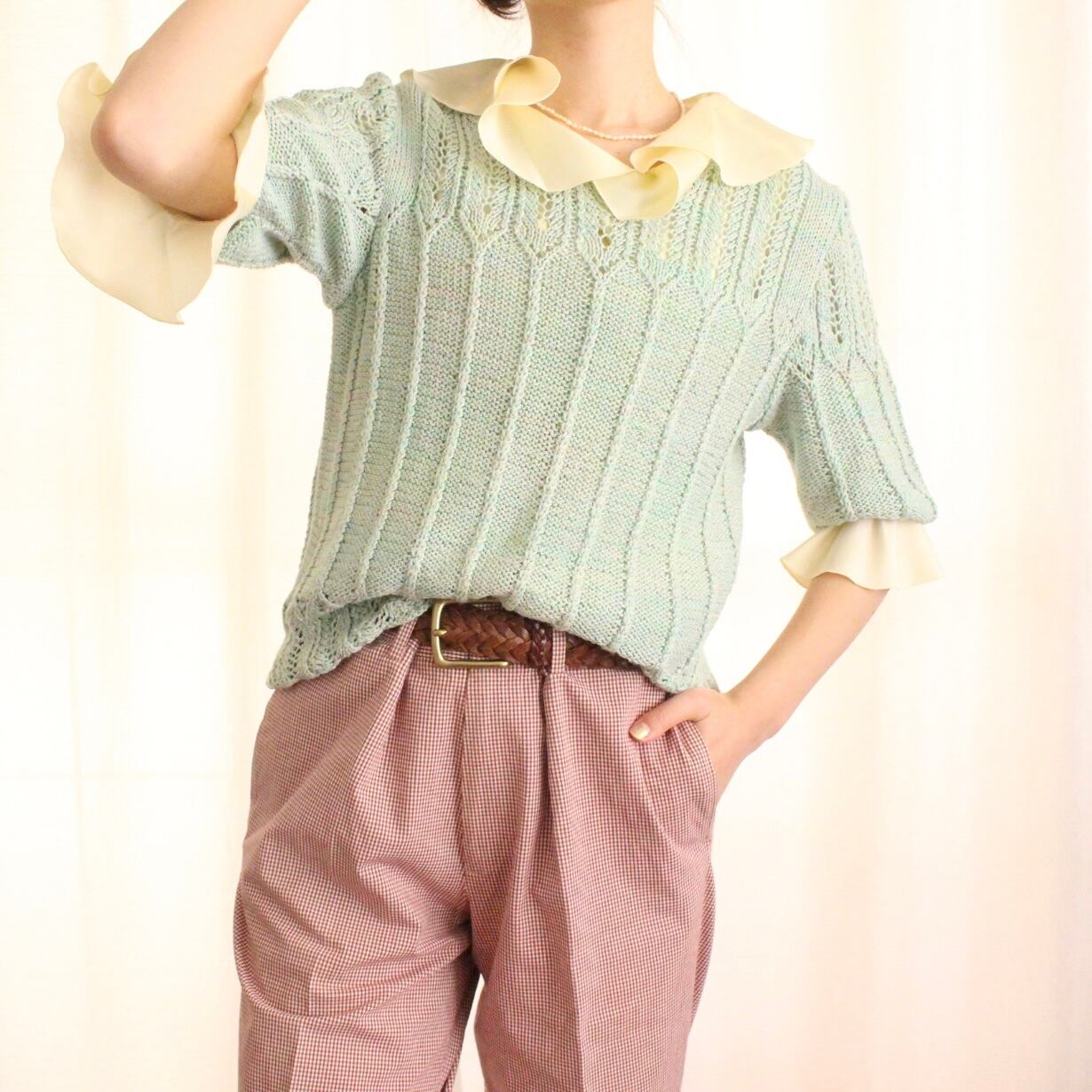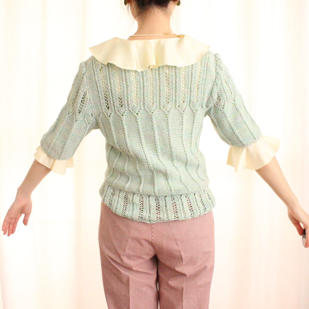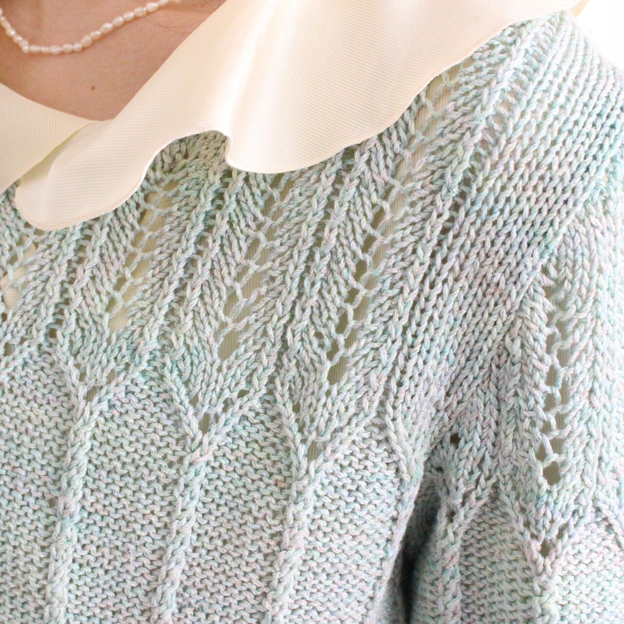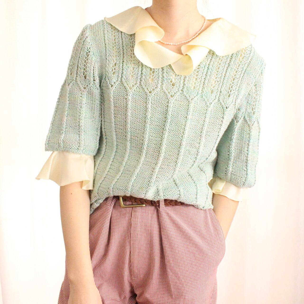 淡いミントグリーンカラーが優しい印象で春らしいハンドニット。