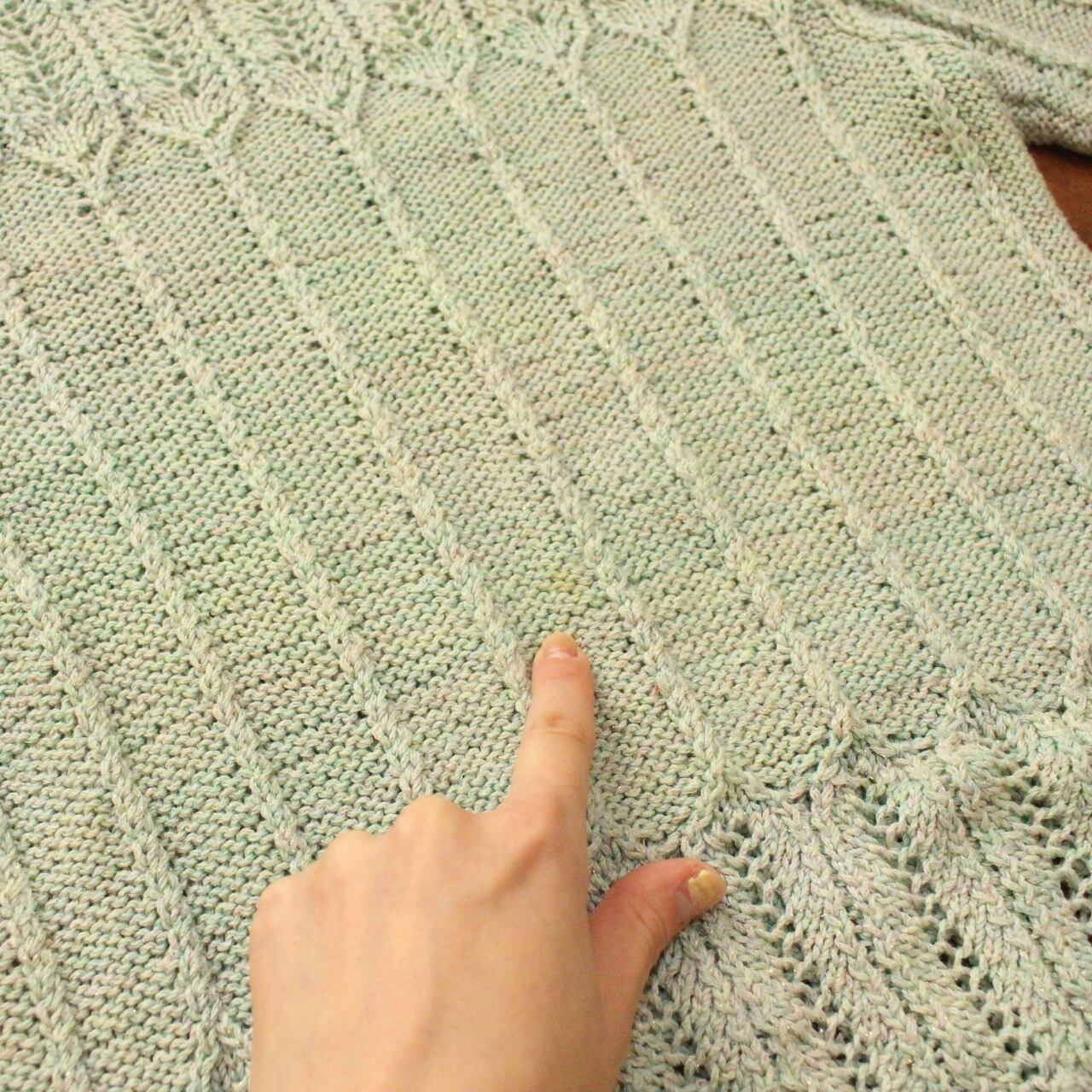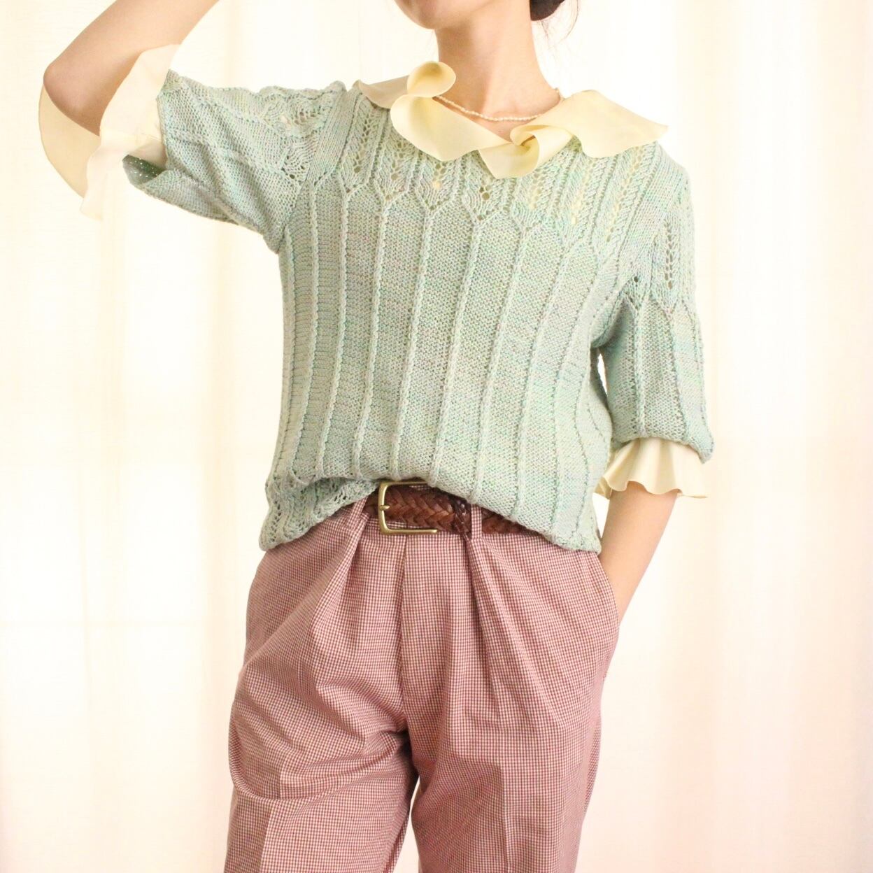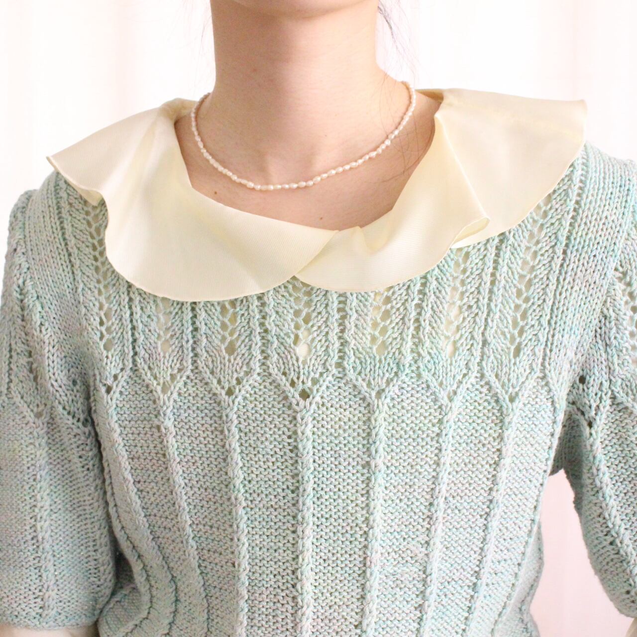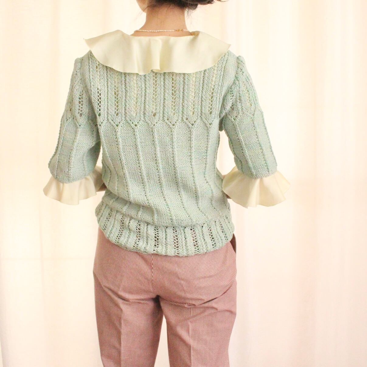 淡いミントグリーンカラーが優しい印象で春らしいハンドニット。