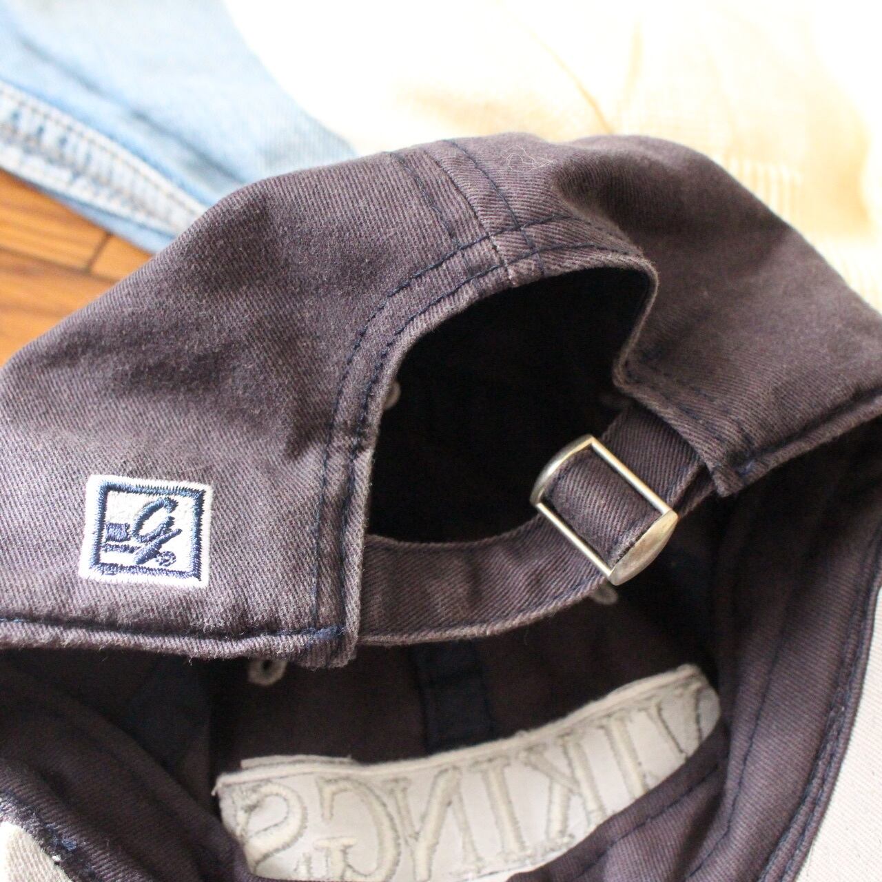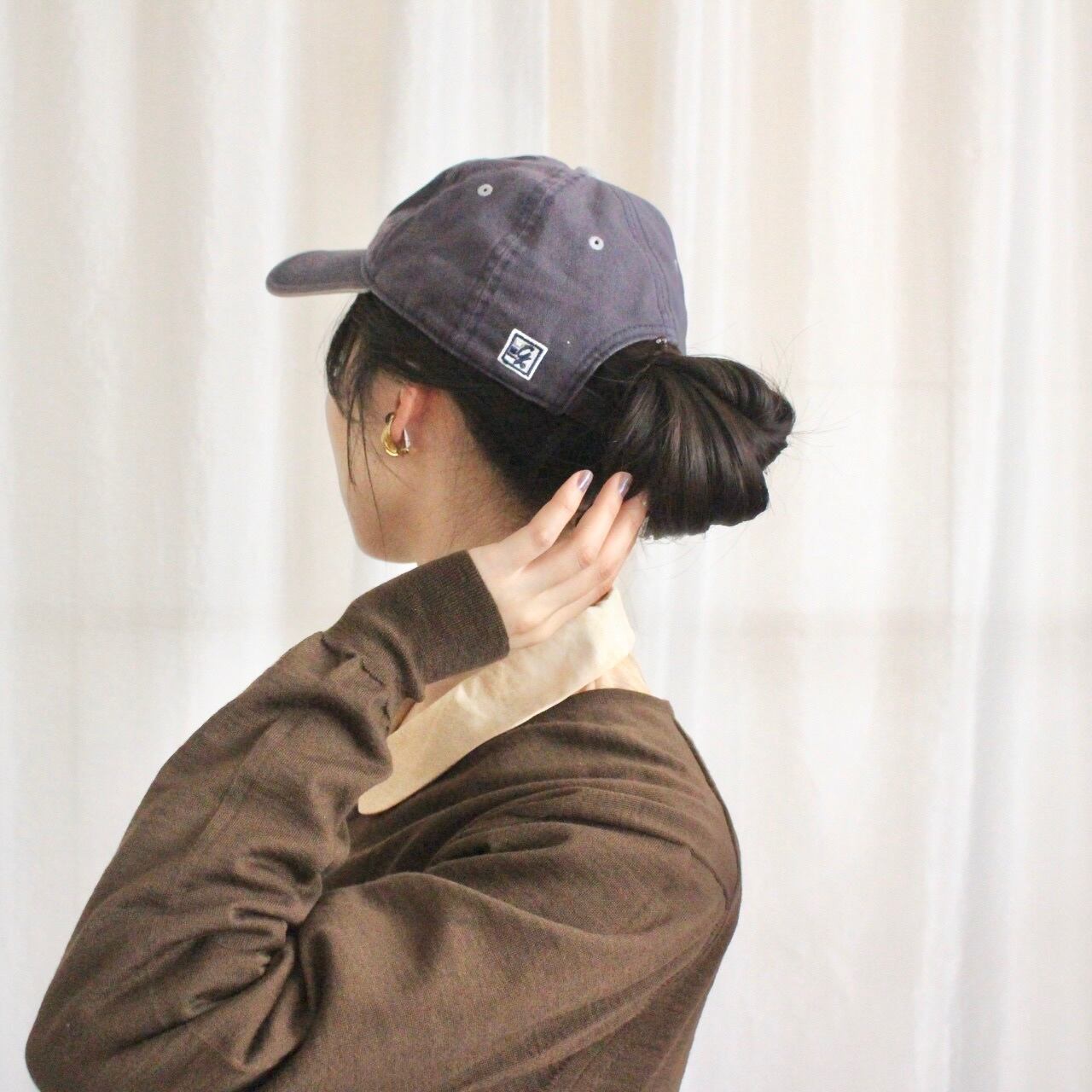 シンプルでベーシックなロゴ入りネイビーのキャップ。色あせ感がいい味を出してくれて、一点取り入れるだけでコーデにこなれ感がでます◎